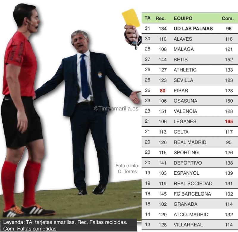 Un registro realmente curioso es que el Leganés, con 165 faltas cometidas (69 más que la UD Las Palmas) ha sido sancionado con 10 tarjetas menos que los jugadores de Quique Setién.