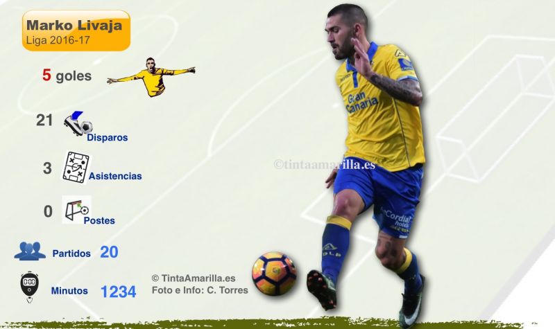 El primer ciclo anual de Livaja como jugador de la UD Las Palmas traiciona sus posibles sensaciones de insatisfacción. Un poder físico notable, incómodo de defender, amplia capacidad para el remate (dos goles de cabeza entre los cinco de la Liga), amplitud de recursos para el juego de espaldas o asociativo.
