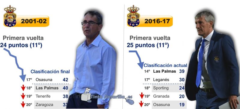 La UD Las Palmas de 2017 imita hasta ahora la pésima segunda vuelta de 2002, que acabó en descenso aunque entonces la salvación estaba en la frontera de los 42 puntos