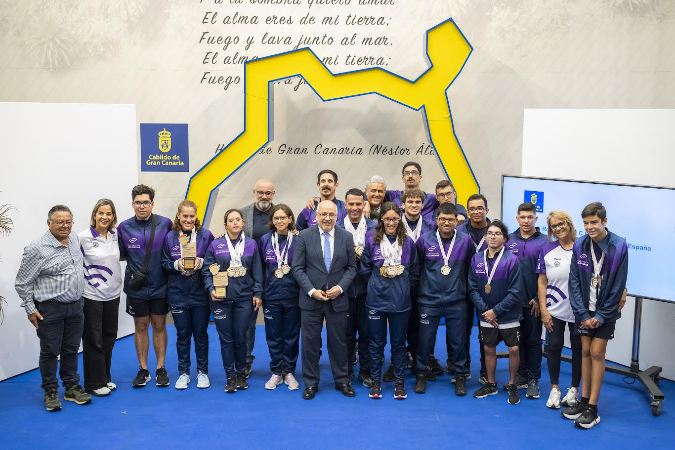 El presidente del Cabildo de Gran Canaria, Antonio Morales, y el consejero de Deportes, Aridany Romero, recibieron al Club Natación Las Palmas, reciente campeón del XXXII Campeonato de España de Natación organizado por la Federación Española de Deportes para Personas con Discapacidad Intelectual (FEDDI) y el propio club. El encuentro, que se celebró en la sede del gobierno insular, sirvió para poner en valor no solo los excelentes resultados deportivos, sino también la capacidad organizativa del club como anfitrión de una cita que, por primera vez en su historia, se celebró en la isla.