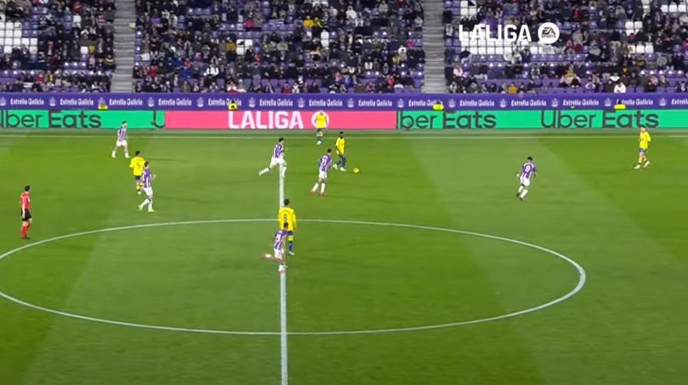 La jugada de marras tiene como protagonista a Dario Essugo, que renuncia a realizar un pase sencillo, con dos opciones que están a pocos metros de su posición. El joven centrocampista portugués está rodeado de hasta tres futbolistas del Valladolid en el minuto 28. Tiene en la banda derecha a Viti y unos metros frente a él a Mika Mármol. Incluso están cerca Campaña y Javi Muñoz (que se percata de inmediato de la mala decisión).