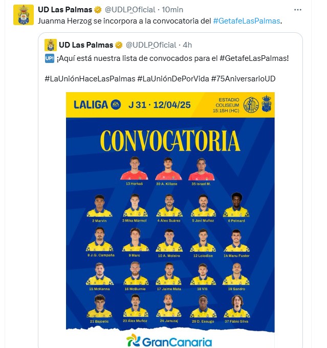Cuatro horas después del anuncio de la convocatoria, la UD Las Palmas anunciaba que Juanma Herzog se unía a la cita del grupo en Madrid.