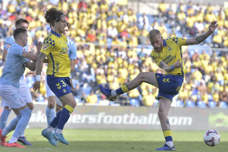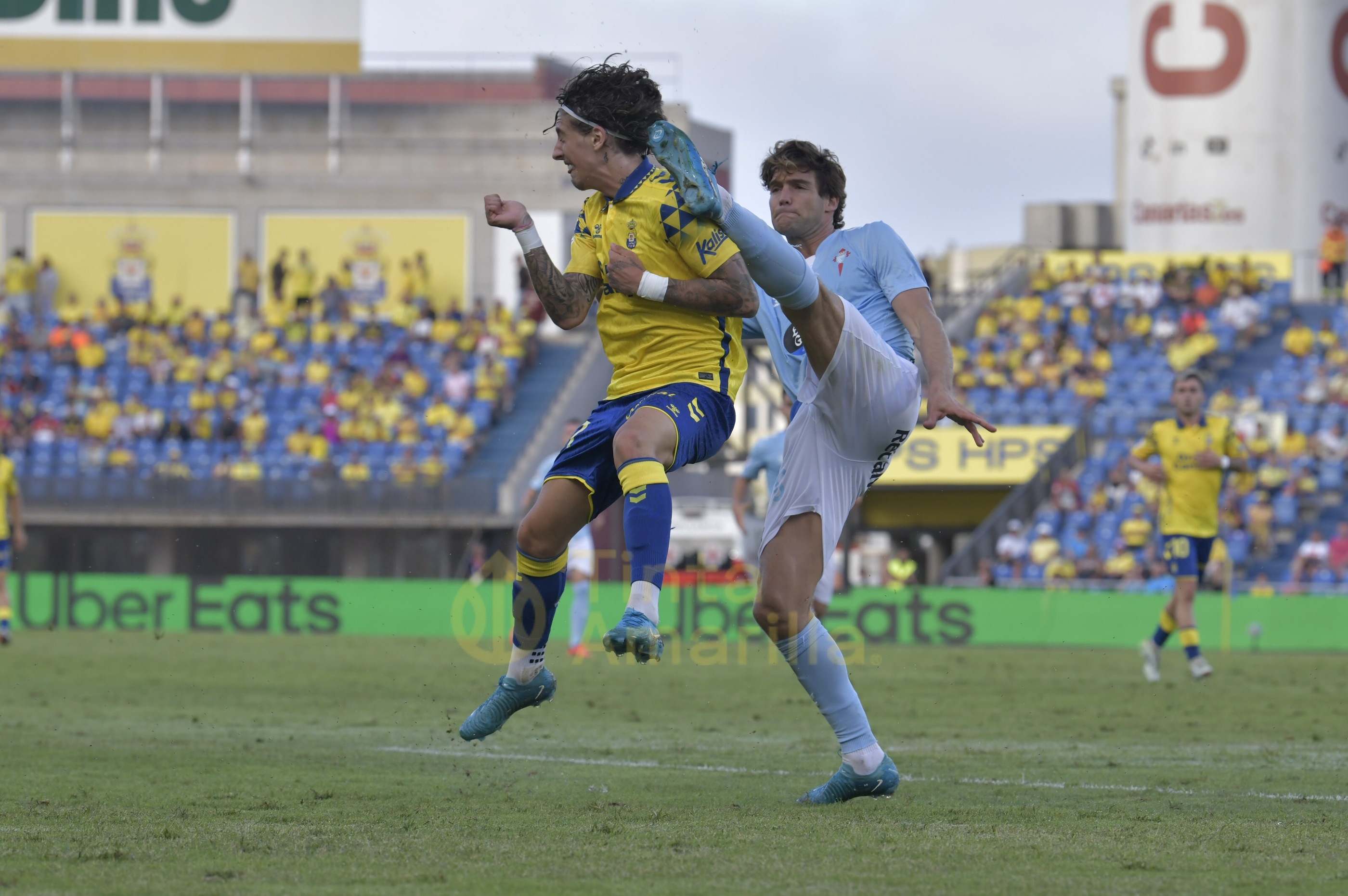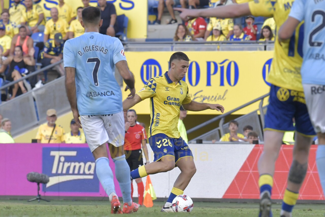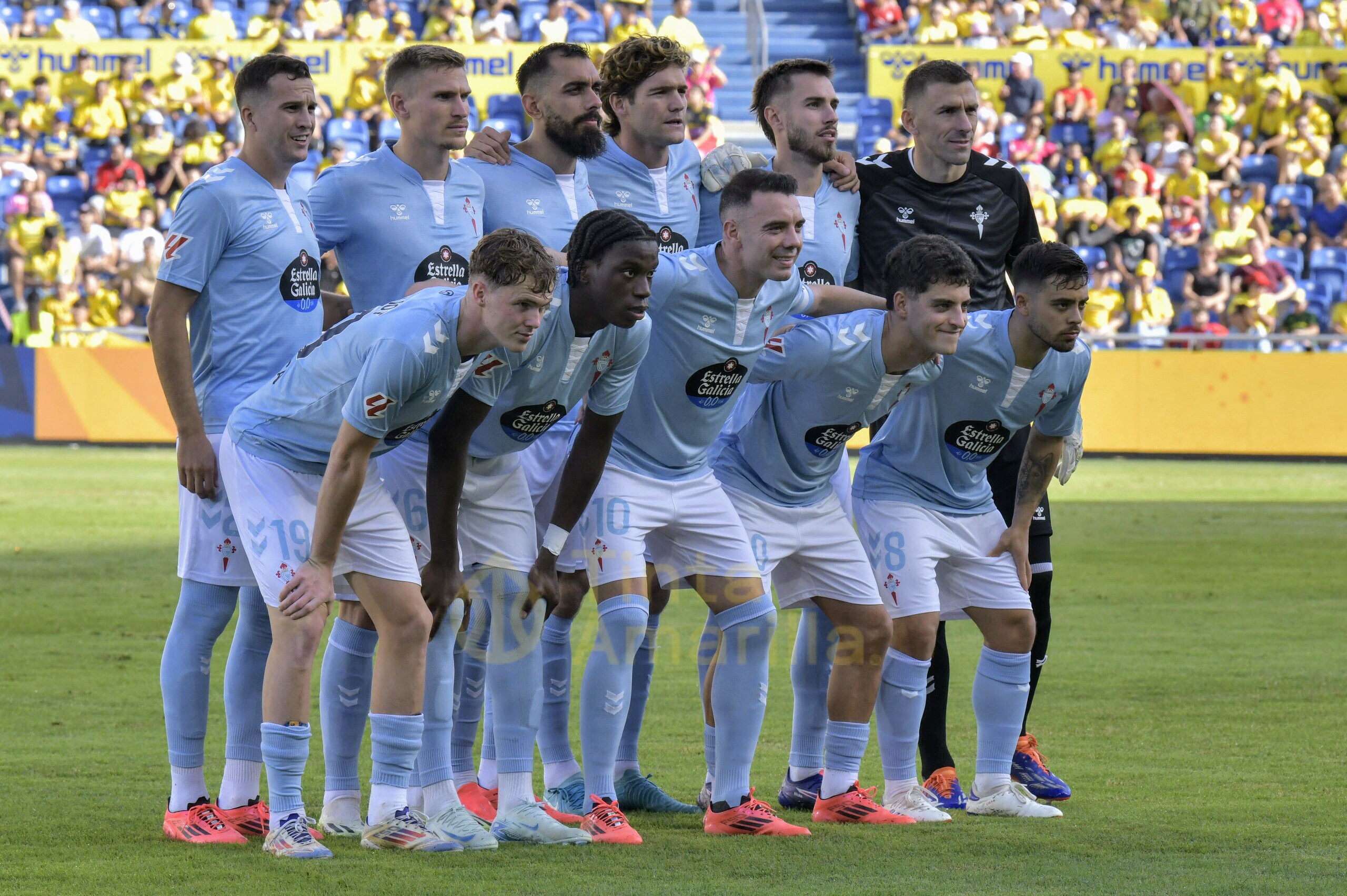 El Celta no tuvo problemas en mostrar sus dos caras casi de inmediato. Cuando la UD Las Palmas iniciaba sus jugadas cerca del centro del campo, los celestes se organizaban con tres líneas de protección: 5-3-2. Y cuando los amarillos se asociaban con el esférici desde área propia, una colección de futbolistas rivales tendía la red de presión próxima a Horkas.