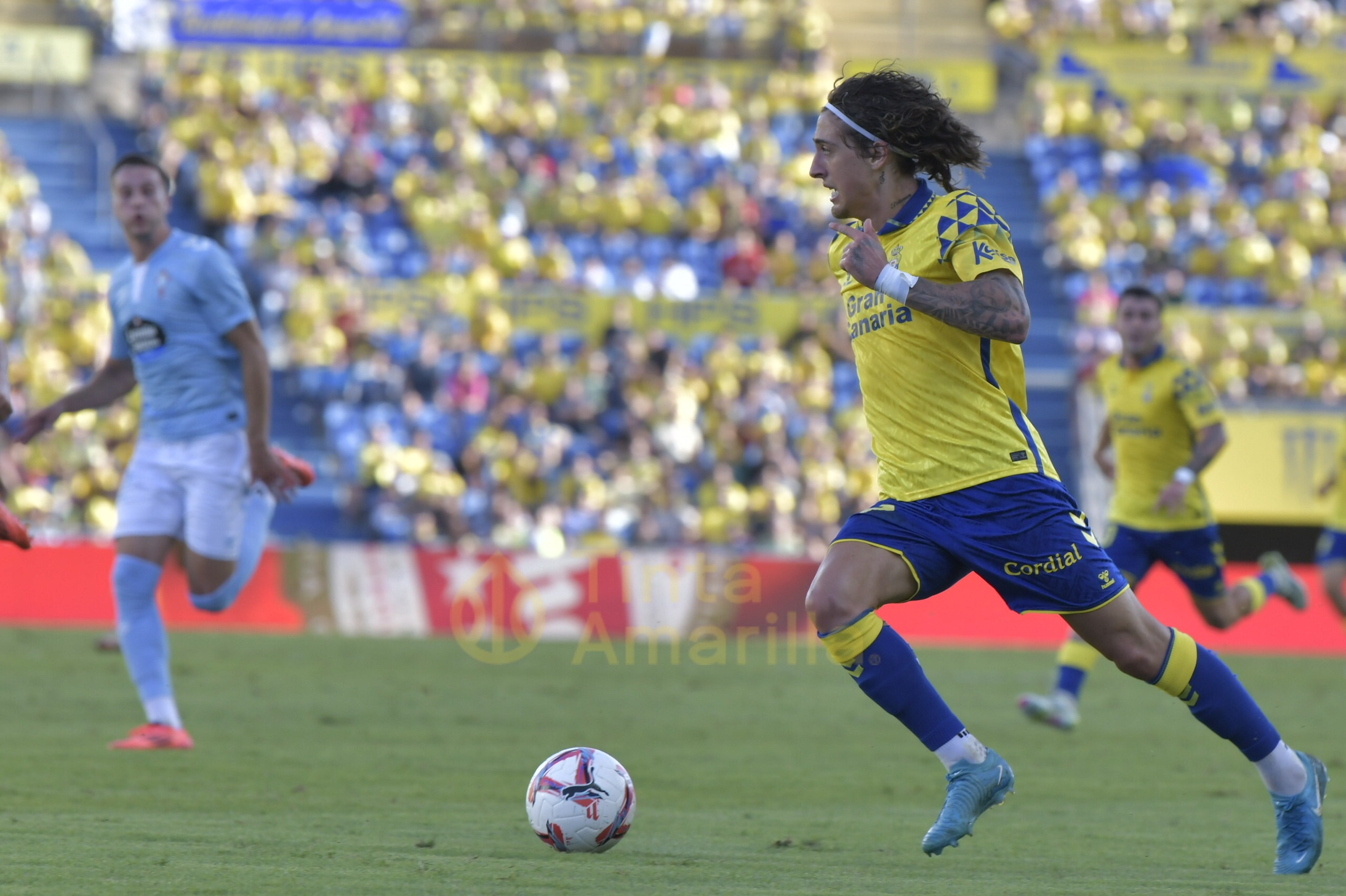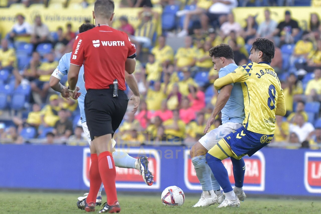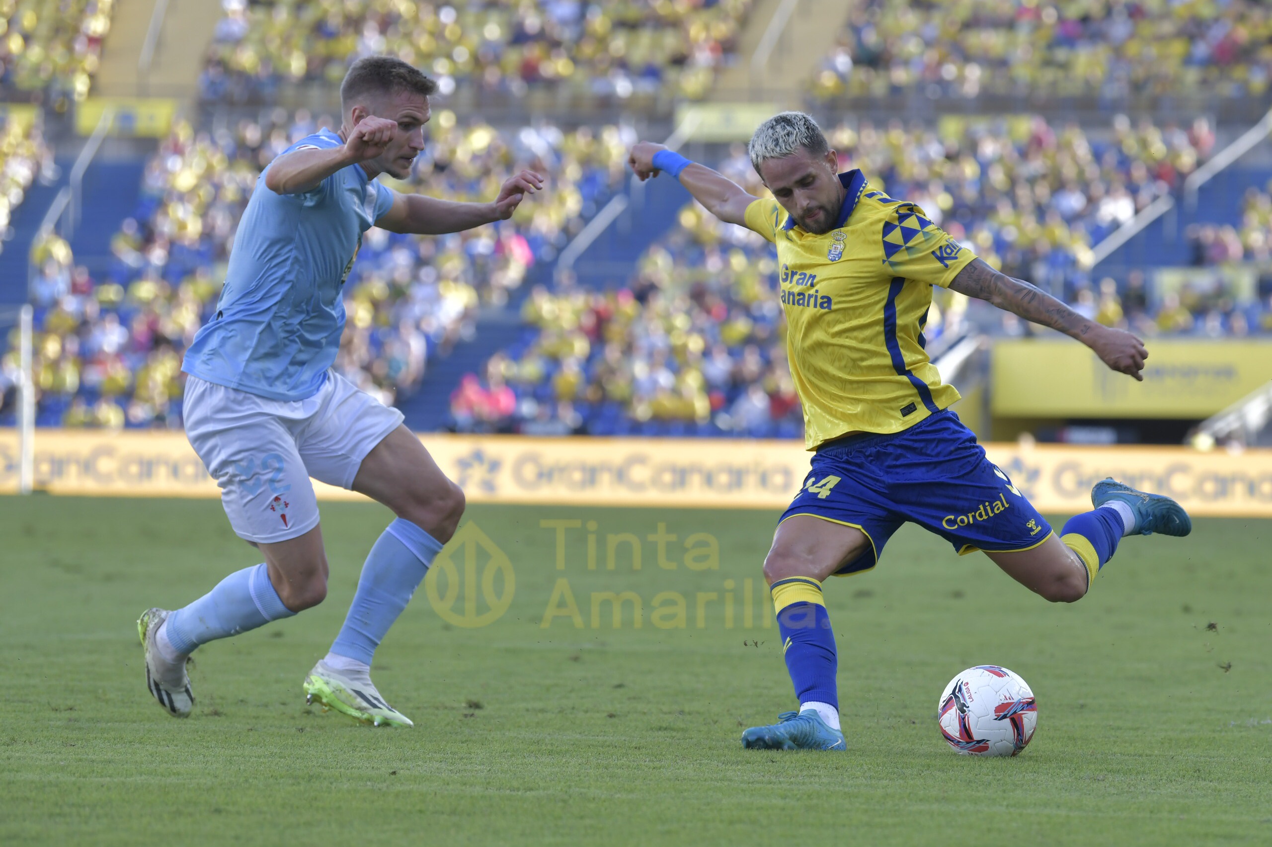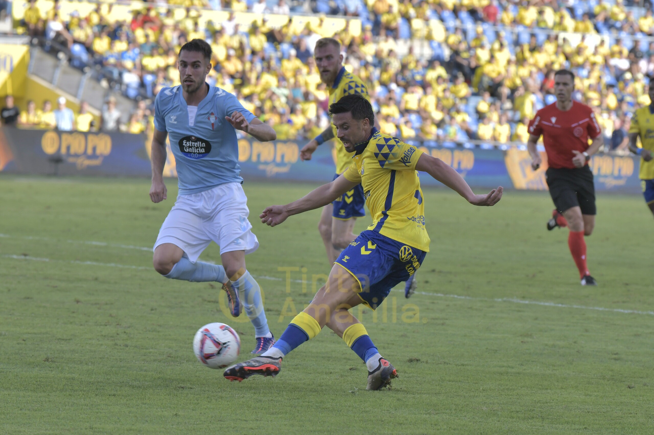 El Celta no tuvo problemas en mostrar sus dos caras casi de inmediato. Cuando la UD Las Palmas iniciaba sus jugadas cerca del centro del campo, los celestes se organizaban con tres líneas de protección: 5-3-2. Y cuando los amarillos se asociaban con el esférici desde área propia, una colección de futbolistas rivales tendía la red de presión próxima a Horkas.