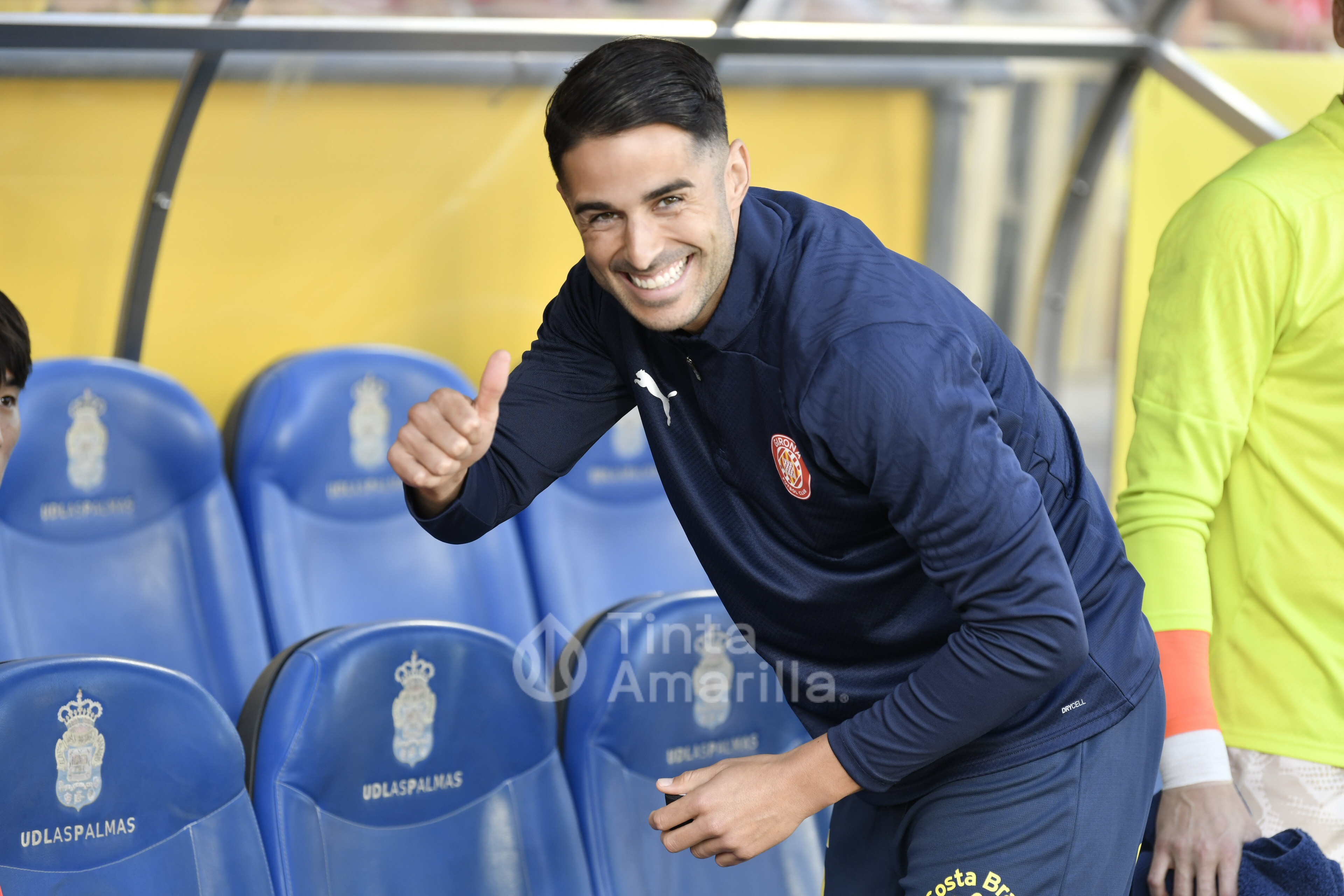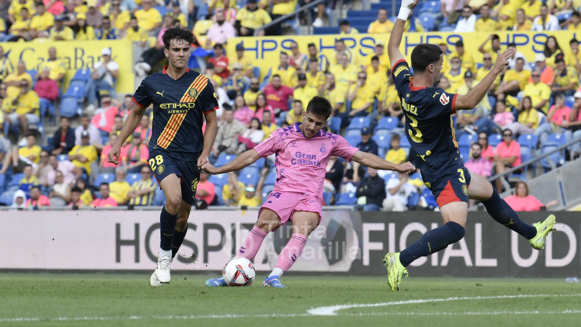 Por momentos, el abordaje del partido ante el Girona recordó parcialmente el comienzo de Mestalla. Las Palmas salió al campo con dudas y sin el balón. Y aunque mantuvo orden en los instantes de incertidumbre, lo cierto es que el primer remate con éxito fue obra de Van de Beek para el Girona. El tanto en el minuto 5 fue anulado por el colegiado, que se percató de una falta previa sobre el defensor Álex Suárez.