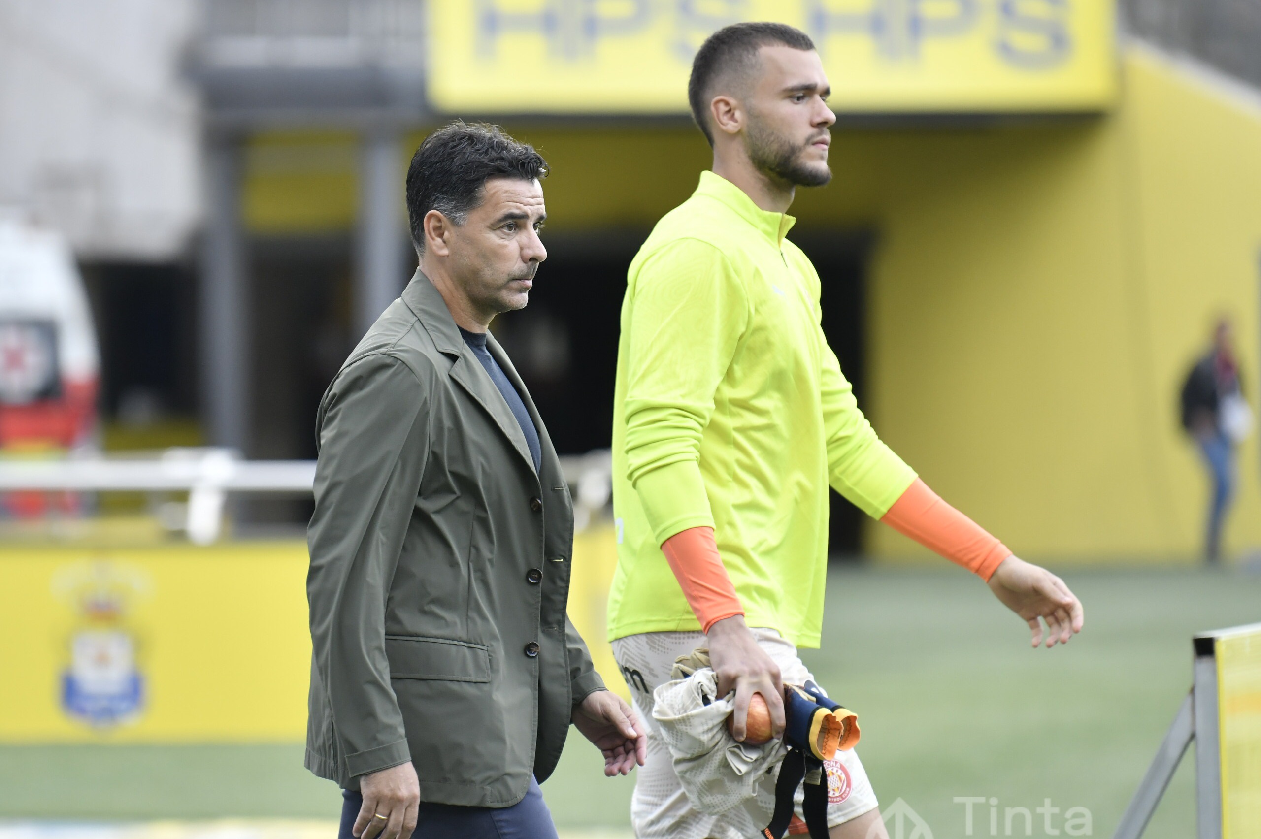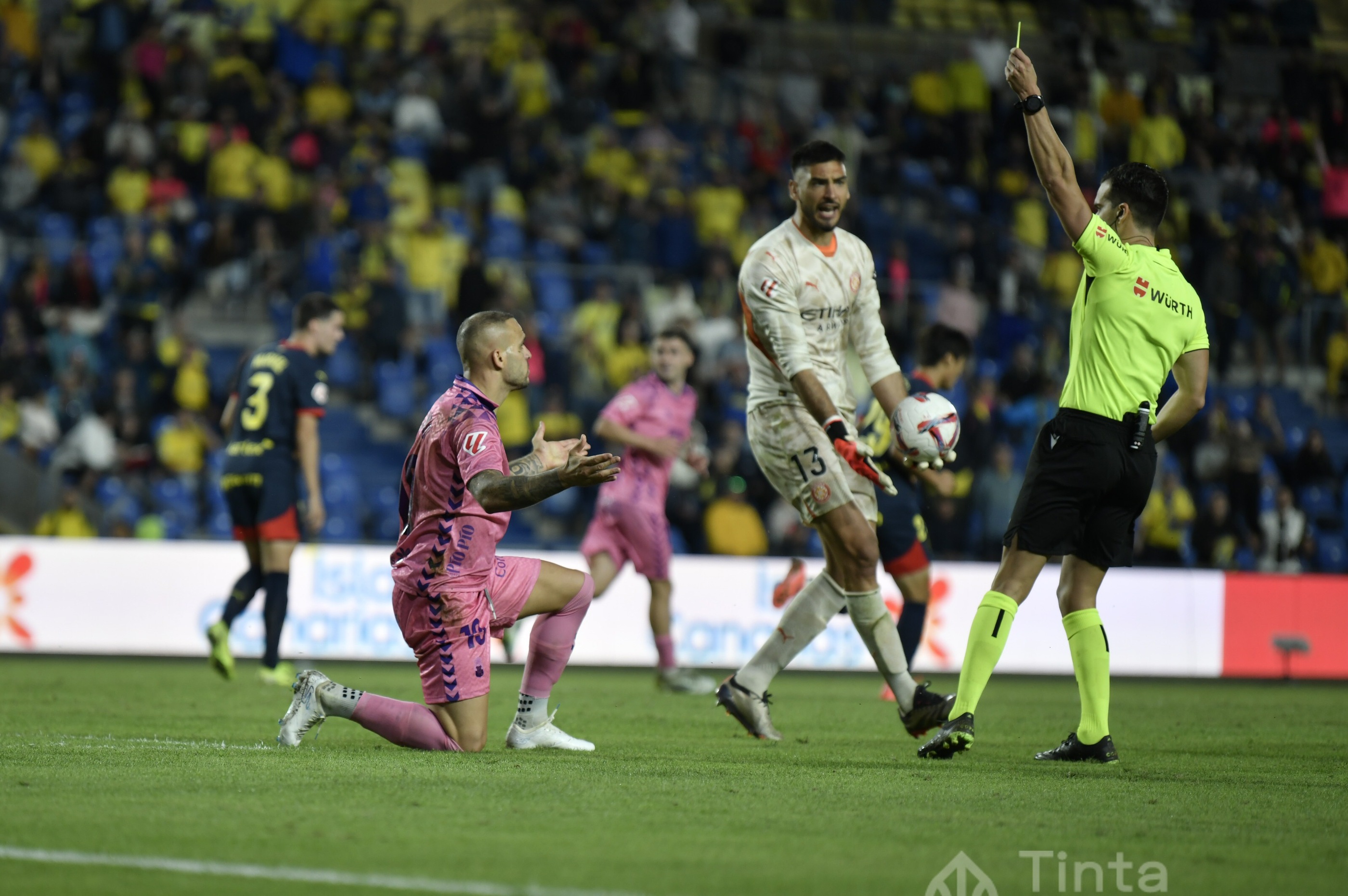 Por momentos, el abordaje del partido ante el Girona recordó parcialmente el comienzo de Mestalla. Las Palmas salió al campo con dudas y sin el balón. Y aunque mantuvo orden en los instantes de incertidumbre, lo cierto es que el primer remate con éxito fue obra de Van de Beek para el Girona. El tanto en el minuto 5 fue anulado por el colegiado, que se percató de una falta previa sobre el defensor Álex Suárez.