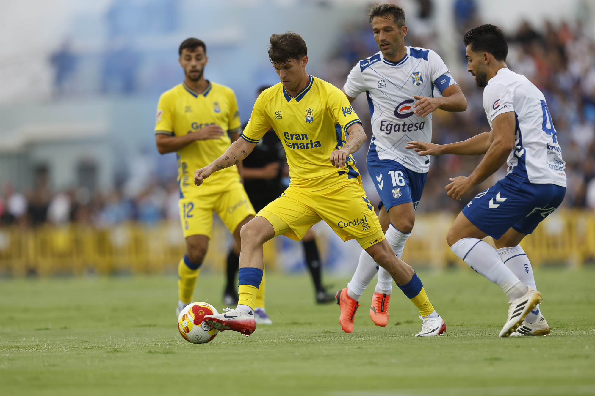 El Tenerife quería poner en aprietos la salida de balón amarilla, como ya ocurrió en los partidos de Marbella. Y, por momentos, la propuesta de Cervera le permitía activar las señales de alarma en la UD Las Palmas.