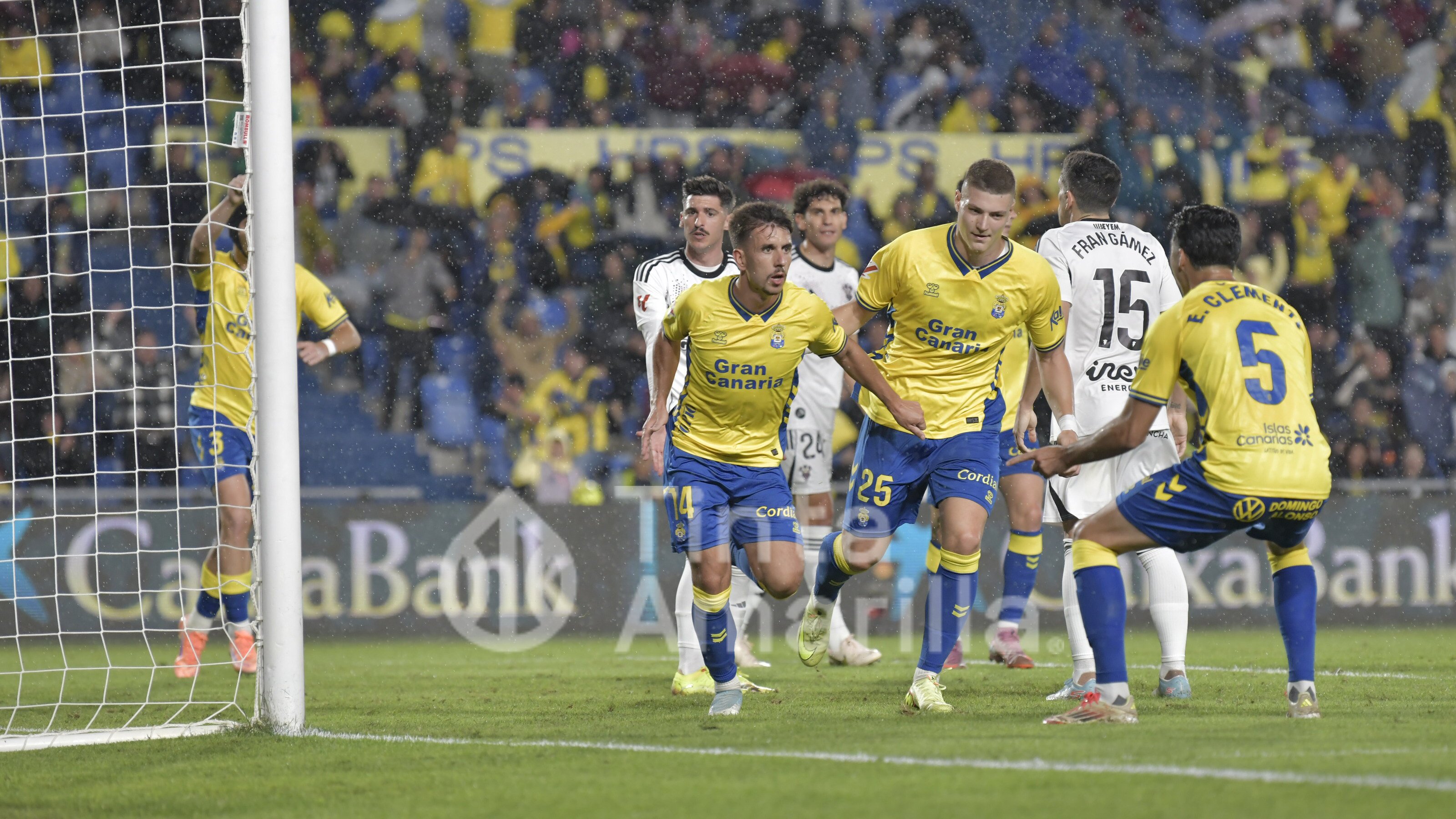 Las señales de alerta hicieron cambiar el rumbo del partido a través de los pases abundantes y la posesión del equipo de Luis García Fernández. Las Palmas se quedó con el esférico y en pocos minutos encontró el gol de apertura, obra de Manu Fuster. La jugada fue propiciada por Pejiño, que forzó un córner. Y de éste, un centro de Iván Gil al corazón del área pequeña donde Fuster apareció picando el balón con su cabeza.