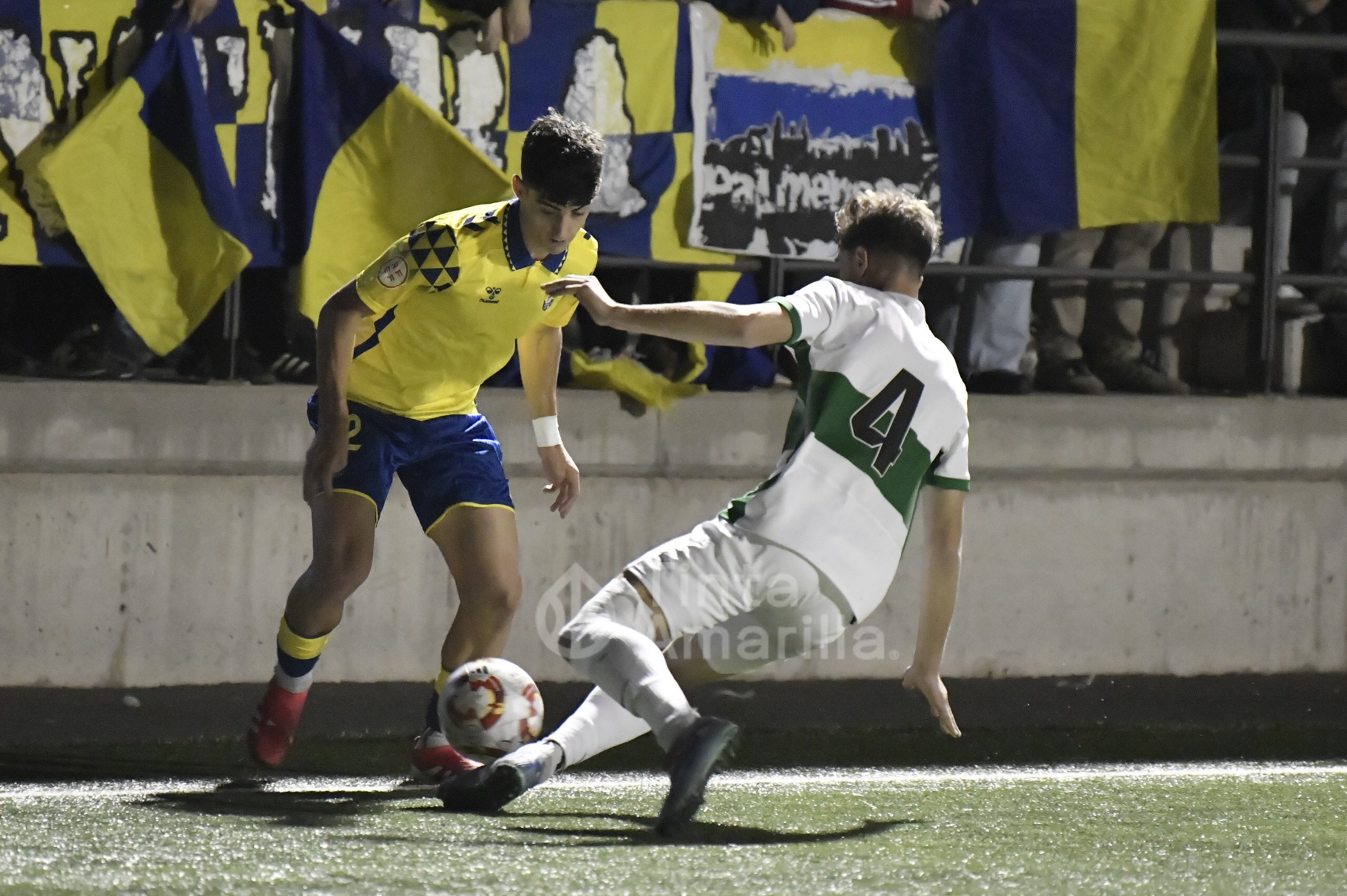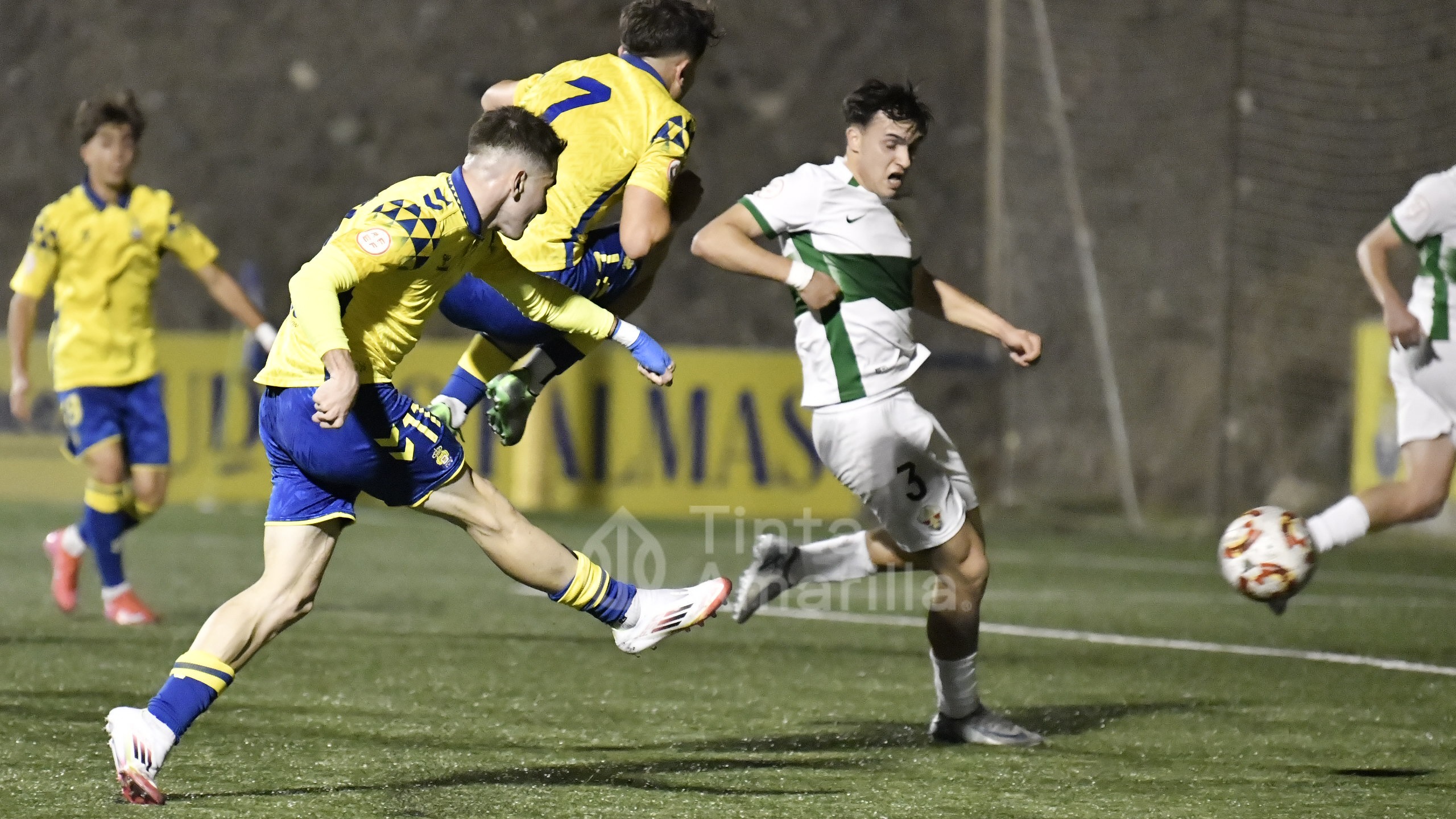 La UD Las Palmas logró este miércoles introducir su nombre en los cuartos de final de la Copa del Rey juvenil (su rival será el Granada) tras noquear en el Anexo al Elche (2-1). Fue una noche intensa, que los jugadores de Héctor Nuez resolvieron a dos minutos del final de la prórroga con un zambombazo de Arturo Rodríguez. El tanto del ariete compensó el gran esfuerzo de los isleños. Primero marcó Las Palmas, a través de Sergio Ruiz, pero el conjunto franjiverde igualó y forzó los 30 minutos extra. Sin embargo, los grancanarios celebraron el triunfo en una jugada in extremis, que buscaron durante toda la noche.