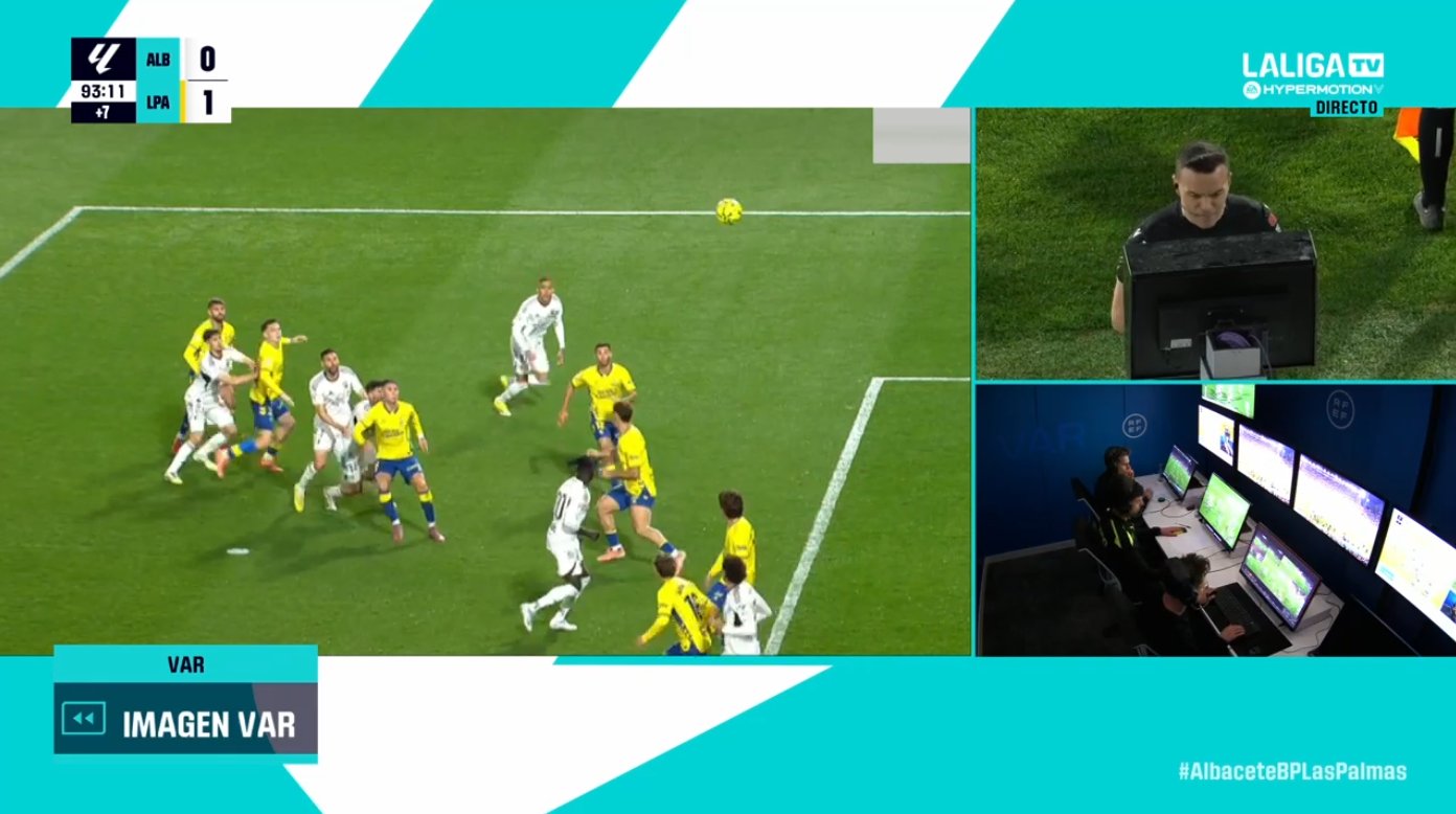 La polémica estaba por llegar. El colegiado, asistido por la sala VAR, señaló un penalti contra Las Palmas en una jugada de córner que remató de cabeza Sánchez. El manchego empujó a Mármol, al que desequilibró antes de que el defensa amarillo tocara el cuero con la mano.