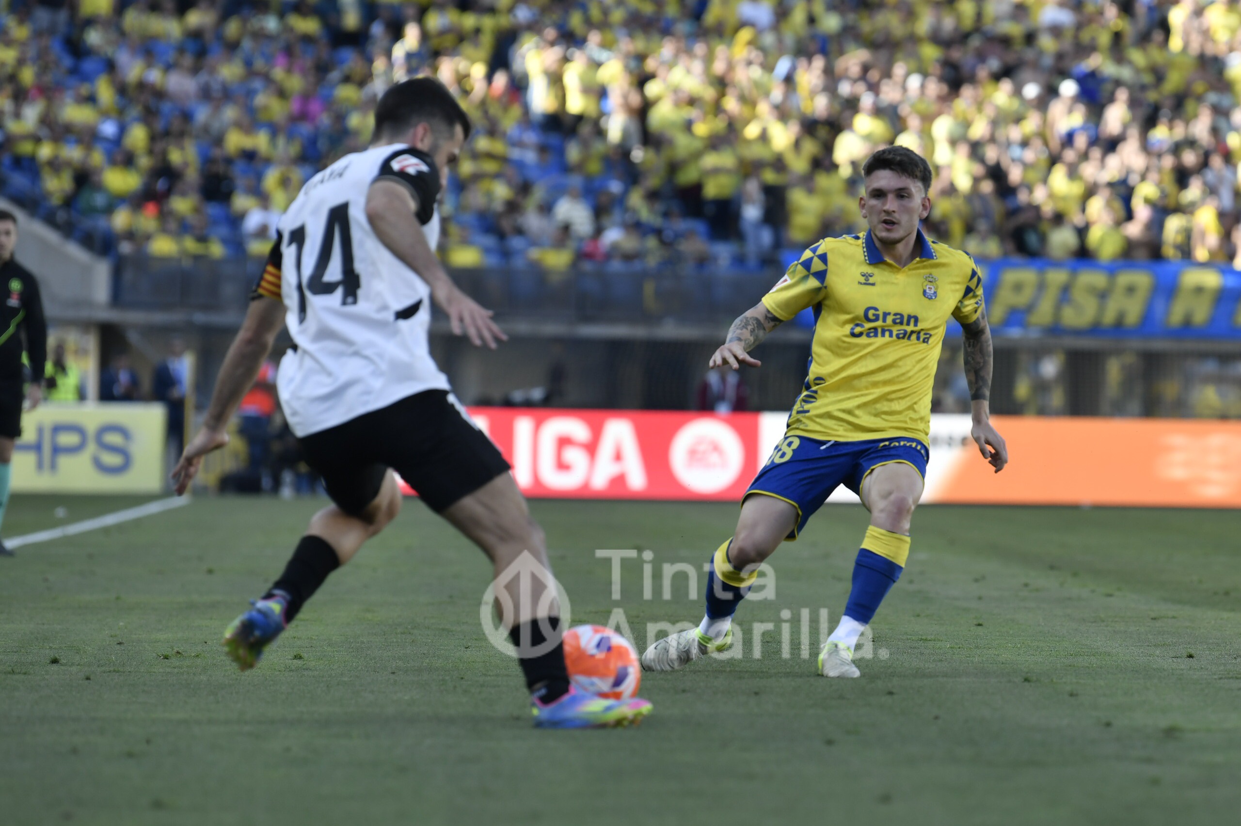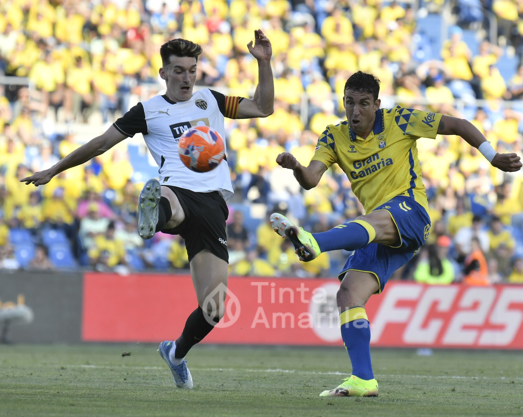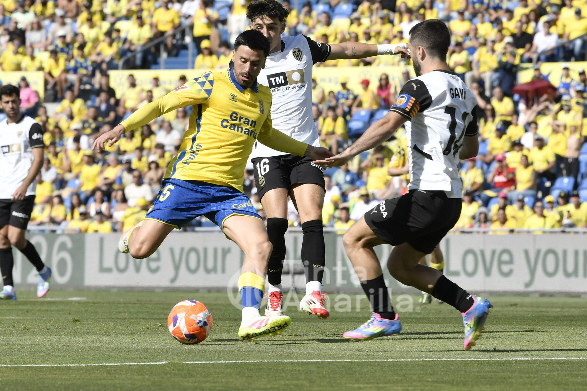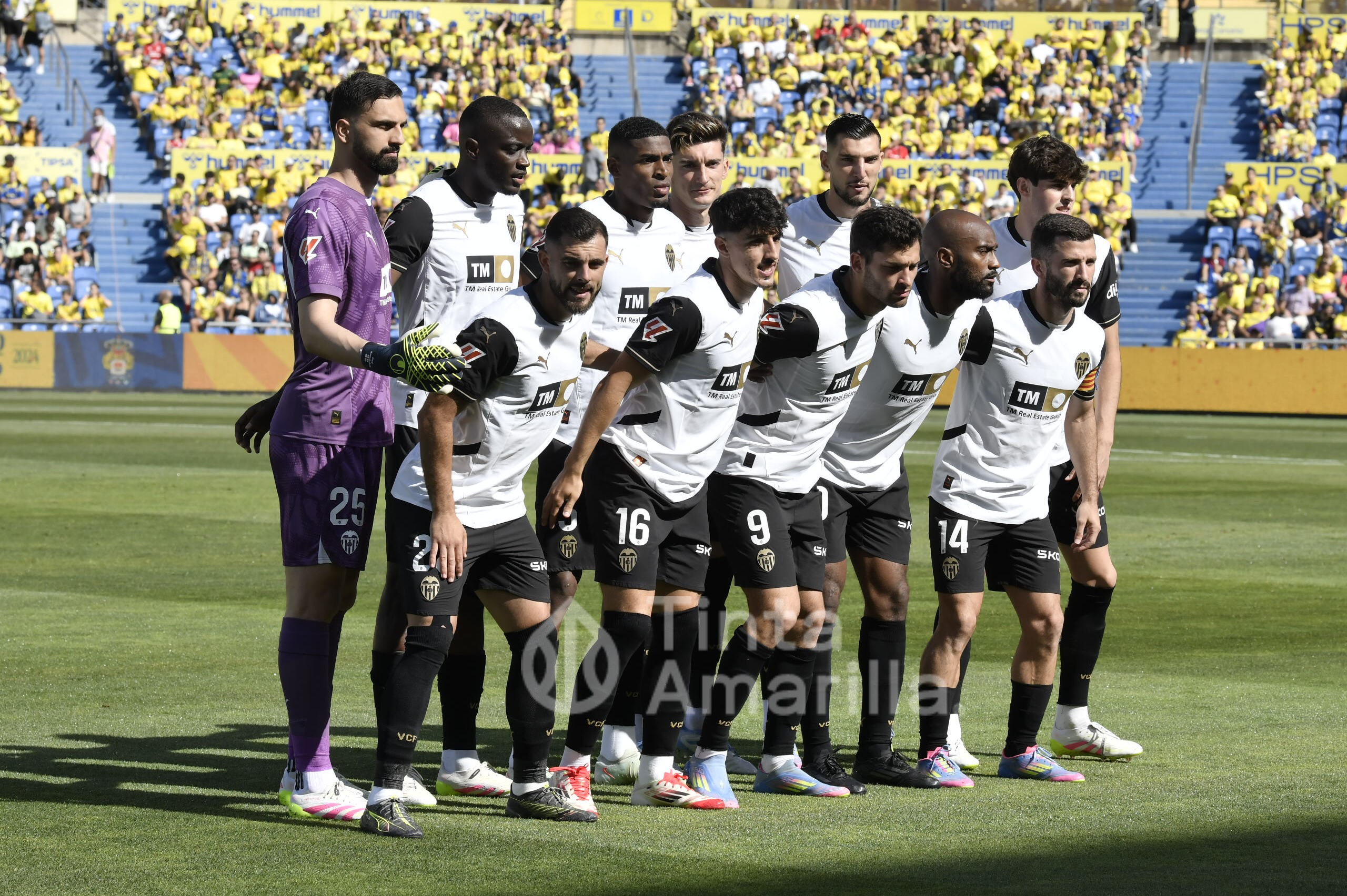No se sentía cómoda la UD Las Palmas con un rival que optó por una solución en ataque con doble punta, compuesta por Mir y Duro. Además, la primera maniobra de peligro del partido fue obra del Valencia, salvando la última línea de presión local, aunque en fuera de juego del ex amarillo Mir.