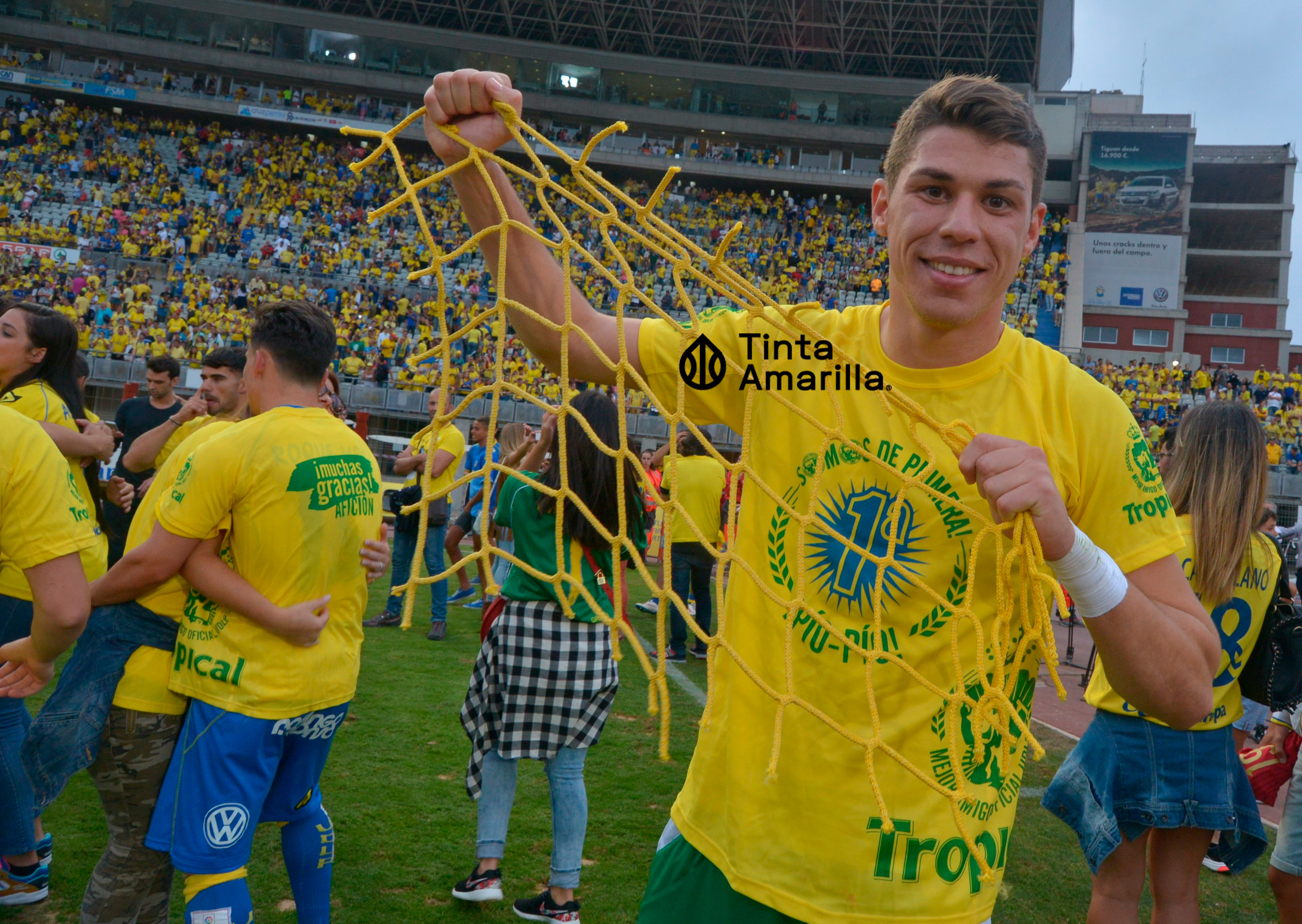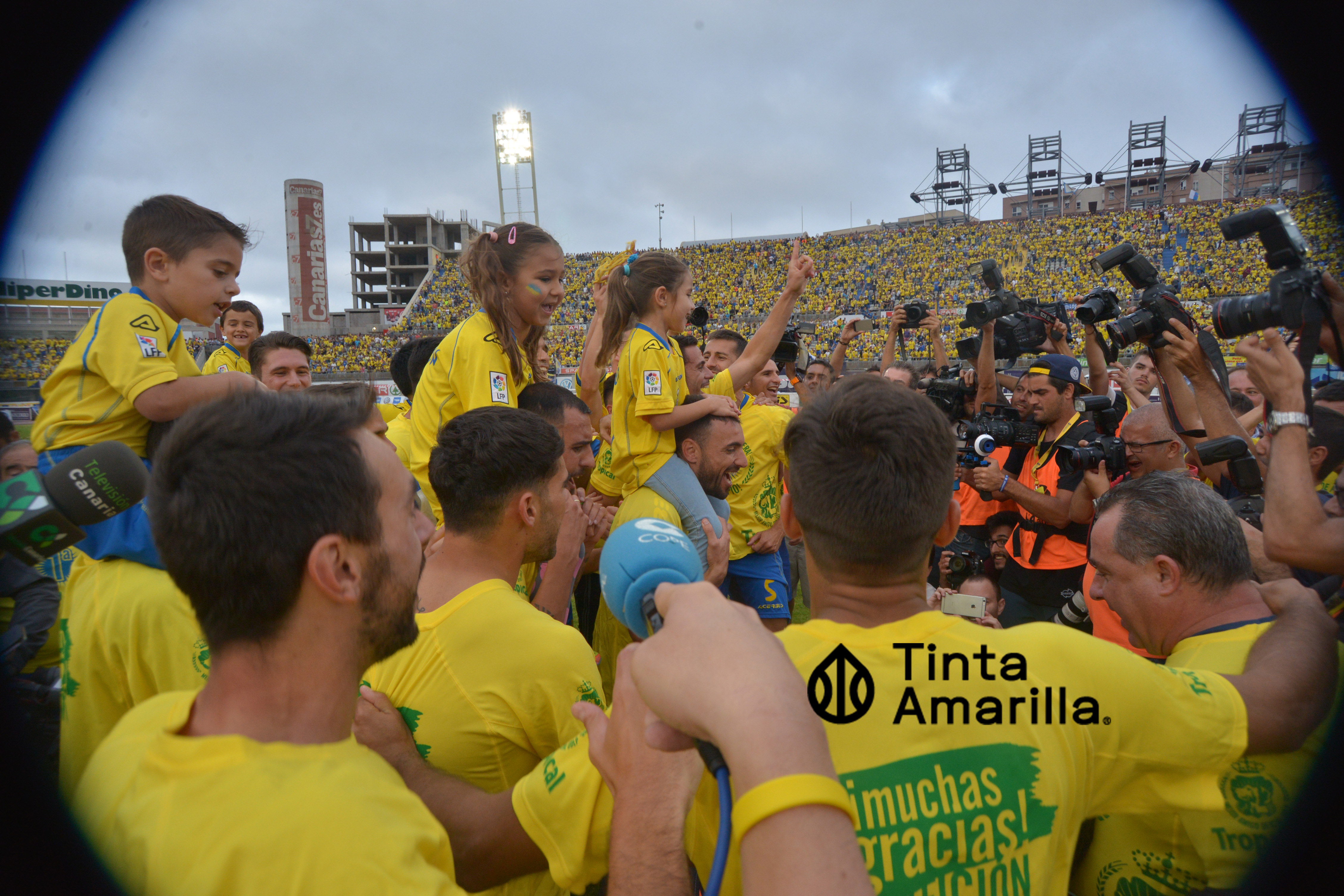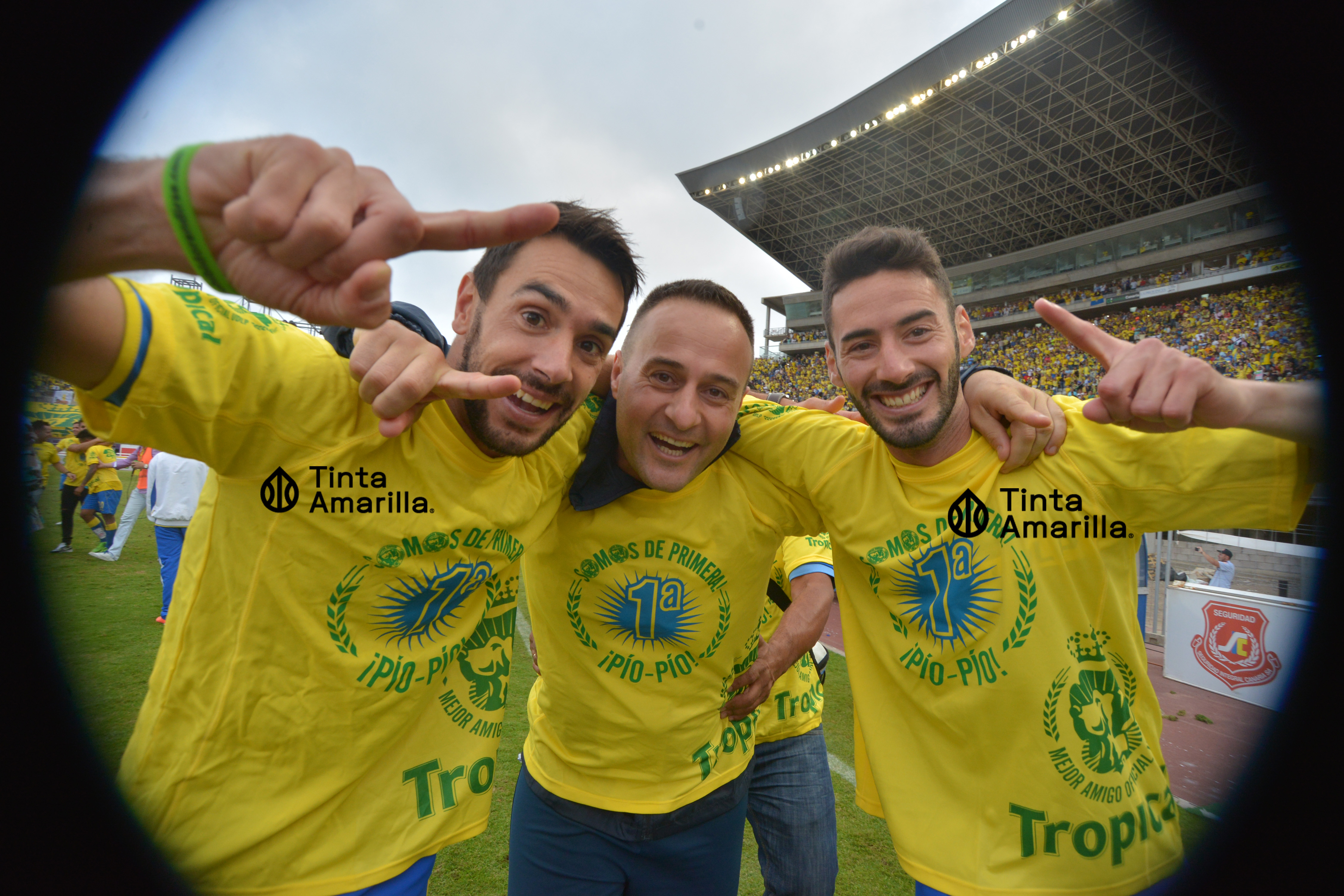Y entonces, ya con el retorno a la Primera División consolidado, se desató la euforia. Fue un ascenso cargado con señales de cantera, porque ocho de los titulares de aquella tarde pasaron por la cadena formativa del club (David Simón, David García, Aythami Artiles, Ángel López, Roque Mesa, Javi Castellano, Asdrúbal Padrón y Jonathan Viera), a los que añadir el relevo de banquillo Hernán Santana, además de los jugadores reservas Raúl Lizoain, Nauzet Alemán, Dani Castellano y el mismísimo Juan Carlos Valerón. Casto, Culio y Sergio Araujo completaron el once de un día tan memorable.