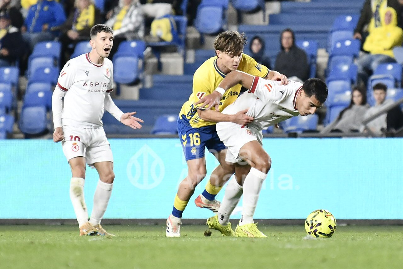 Pormenores: Partido de la 19ª jornada de Liga de Segunda División, último oficial de 2025, disputado en el Estadio de Gran Canaria (14.000 personas). Realizaron el saque de honor los campeones del Mundo de tenis playa, con toque de balón por parte de Daniela Rodríguez. Los equipos pudieron realizar seis cambios por conmoción cerebral del zaguero visitante, Tomás |