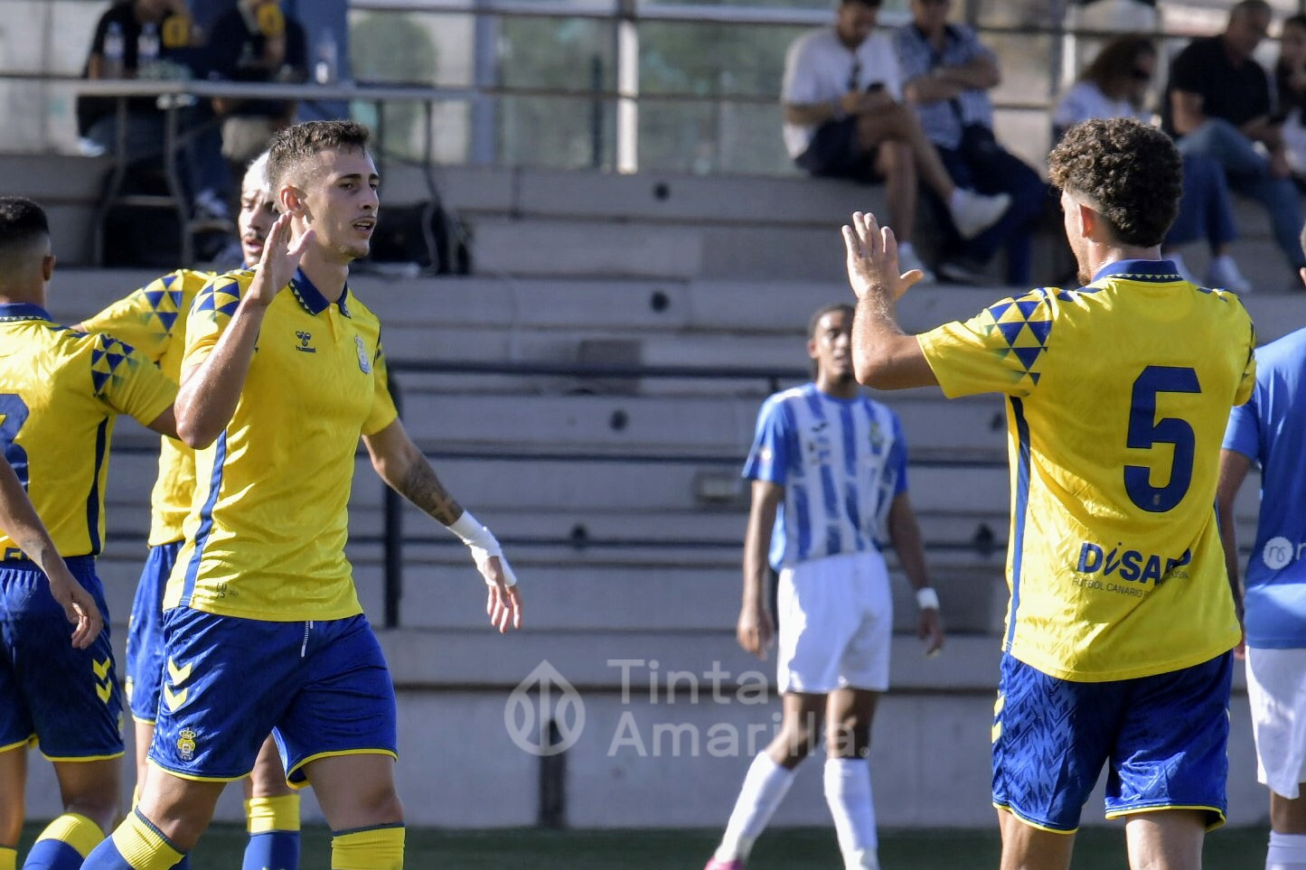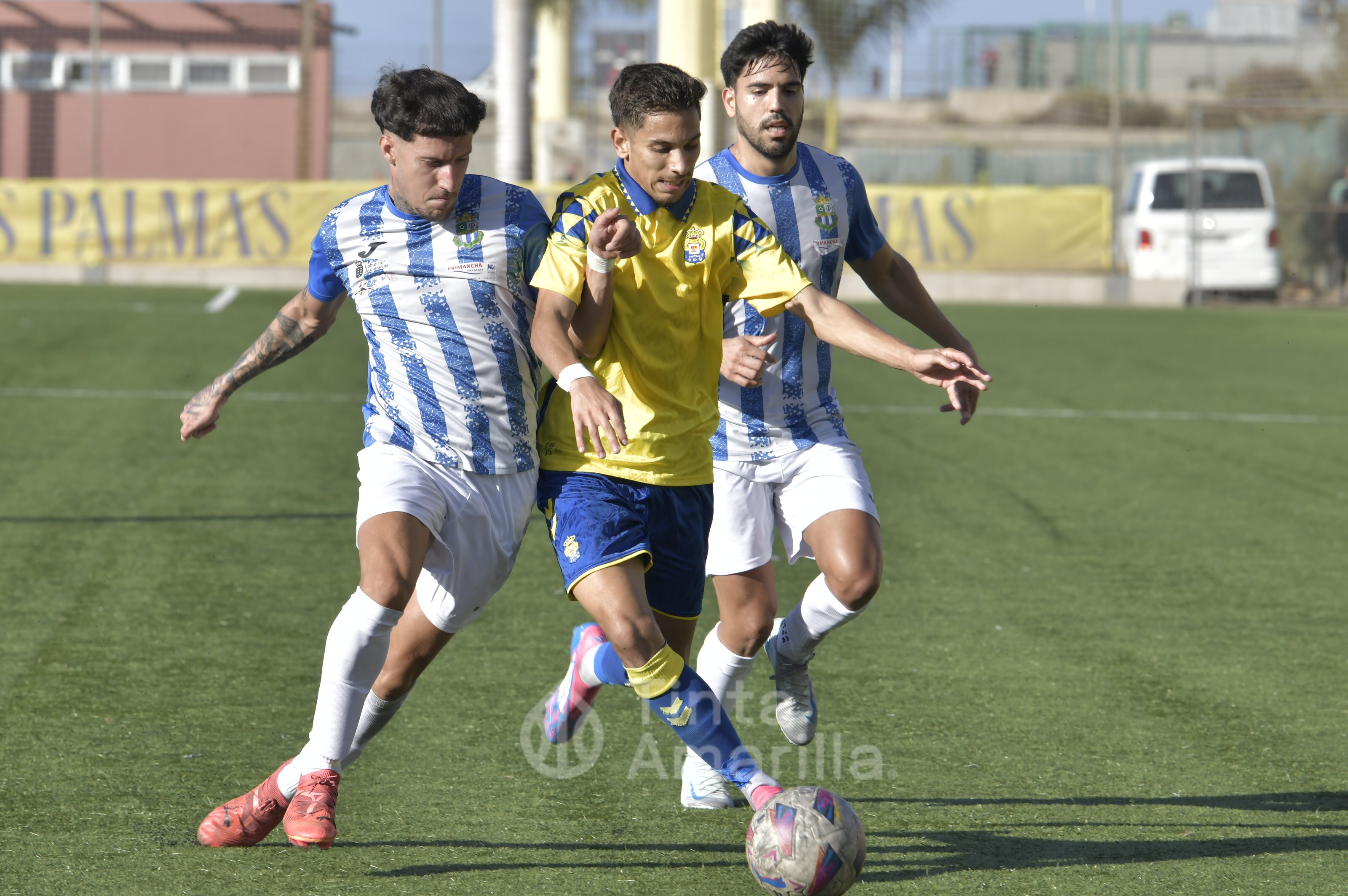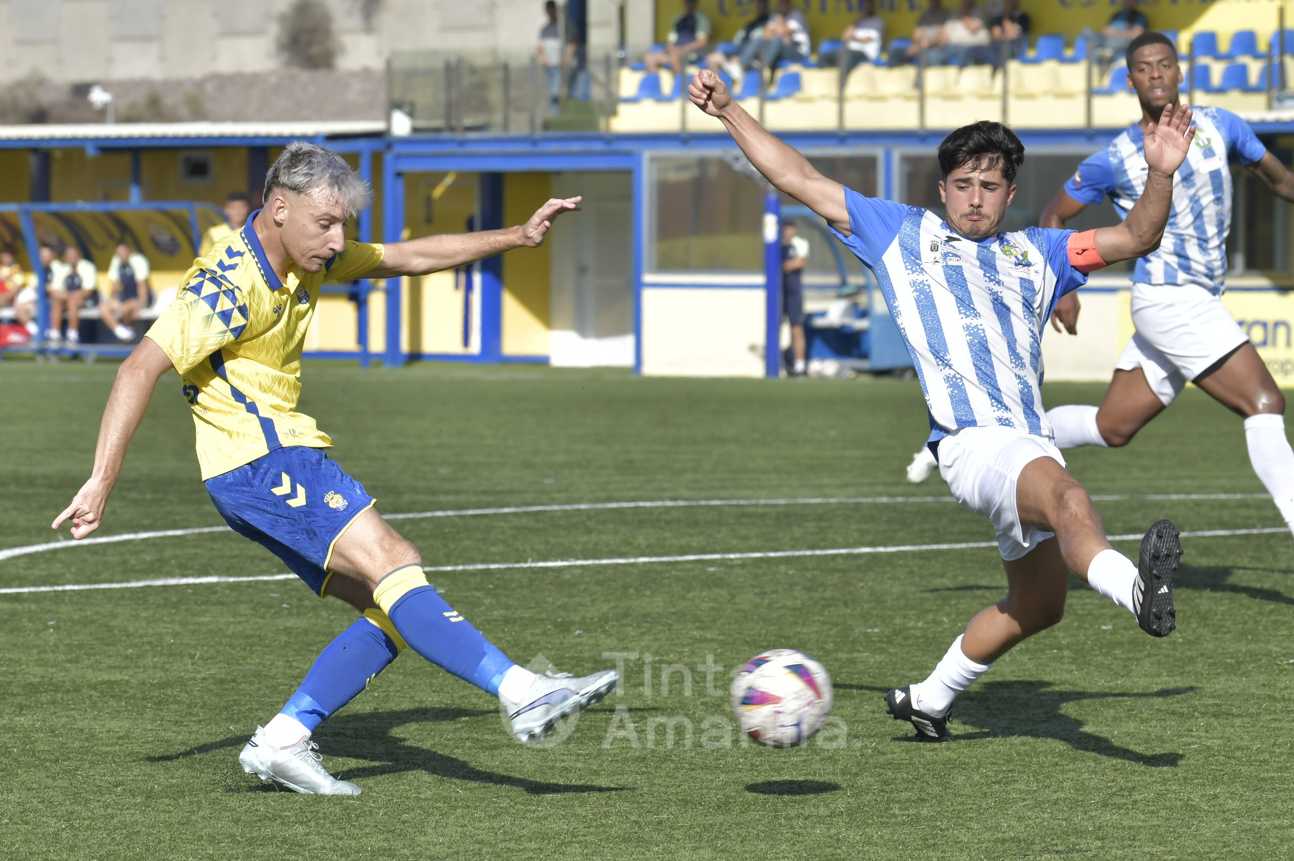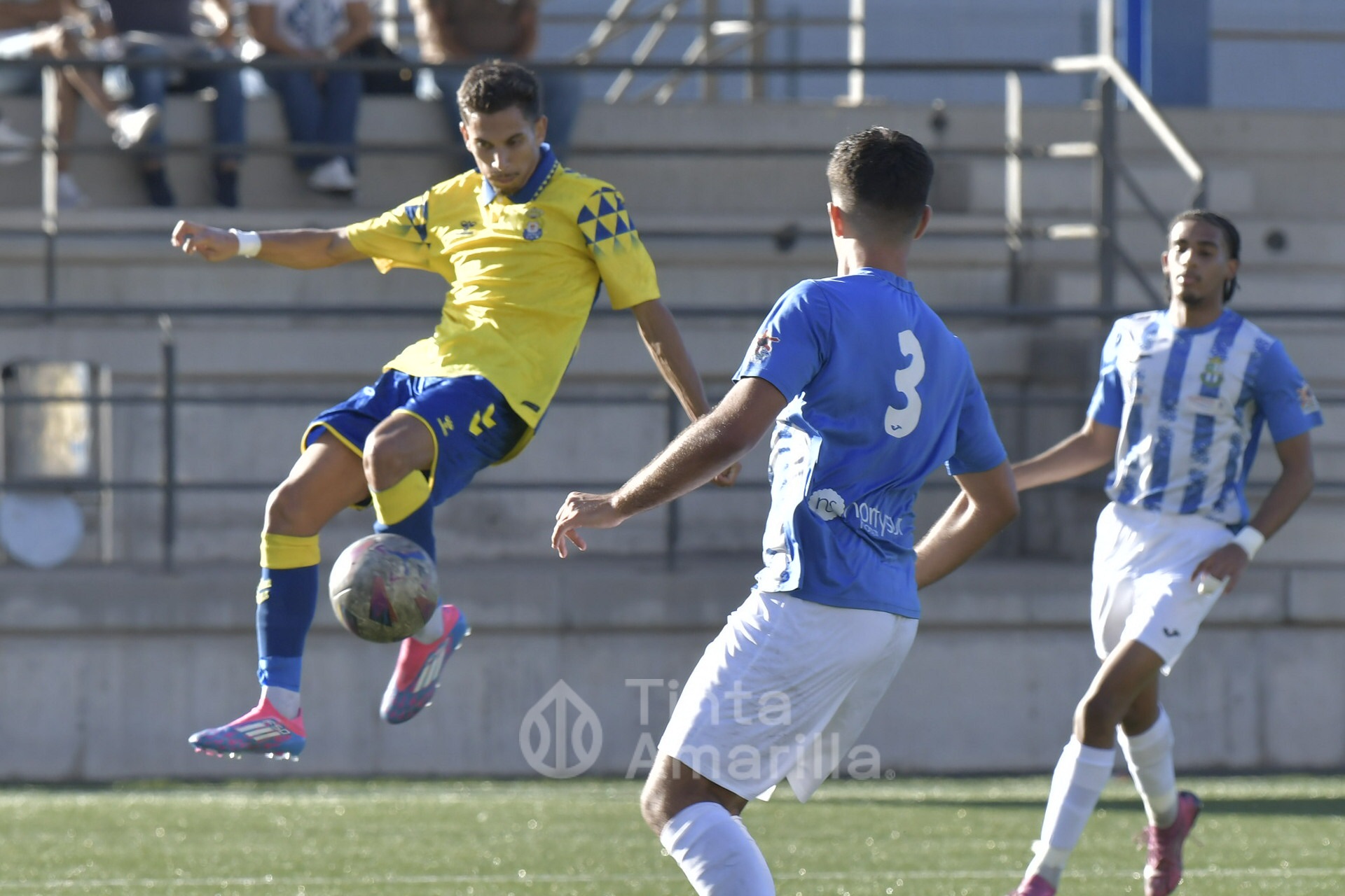 En los primeros minutos del encuentro, Las Palmas C cargó su ataque por el sector derecho donde Hiromi González ganaba carreras y colocaba buenos centros. A los 8 minutos, una de sus jugadas la acabó con éxito el central subido al ataque, Zeben Ramos, al rematar cruzado a media altura en el segundo poste.