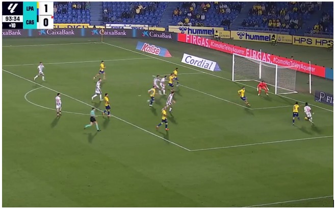 Sin embargo, nadie sigue la estela del central de refresco, Brignani, que llega decidido al área para desviar en solitario el balón pese a que 8 jugadores amarillos (además de Horkas) estaban en situación defensiva. Los dos futbolistas de la UD que no aparecen en la acción defensiva son Jonathan Viera e Iker Bravo, piezas de relevo en el tramo final del partido.