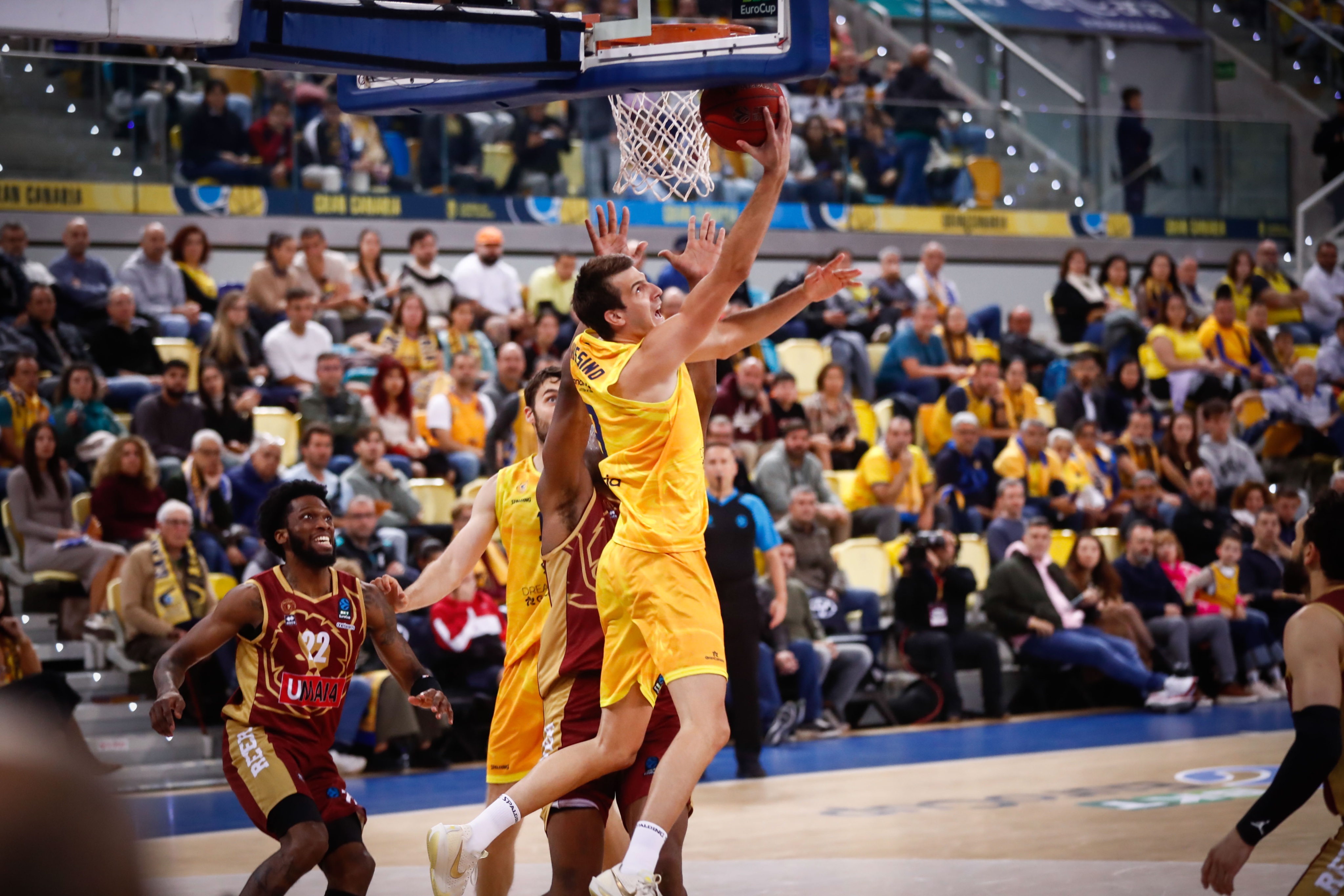 Eso permitió a los italianos mantenerse a la estela, aunque sin dar caza a los amarillos. Cuando el partido aceleraba en sus transiciones le iba mal a la defensa del Gran Canaria. Los triples y las acciones de Medhy Ngouama seguían amenizando el partido. Especialmente un robo y posterior mate del base reserva de Lakovic, colocando el 44-36 que levantó a una grada que parecía adormecida.