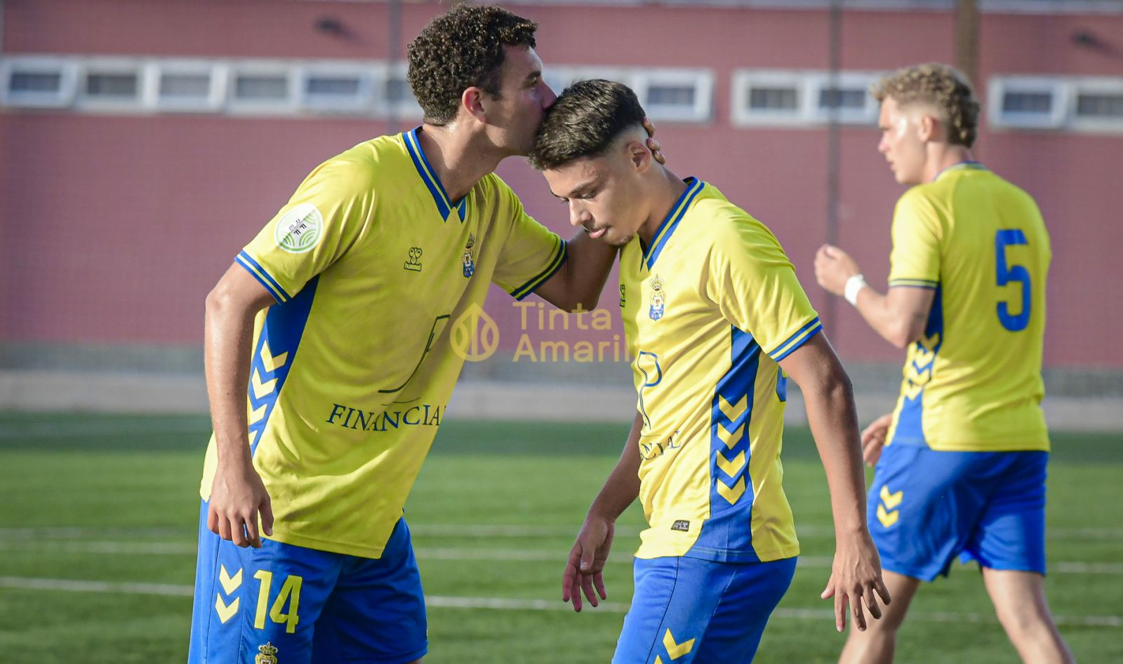 El detalle durante el partido de Las Palmas C contra el San Fernando. Aarón Jorge trata de animar a su compañero Darío Delgado, máximo goleador del filial, antes del lanzamiento de un libre directo. El gesto cariñoso del centrocampista trata de generar confianza en el tinerfeño, el jugoncito del filial de Tercera RFEF. La jugada no acabó con éxito, no obstante.