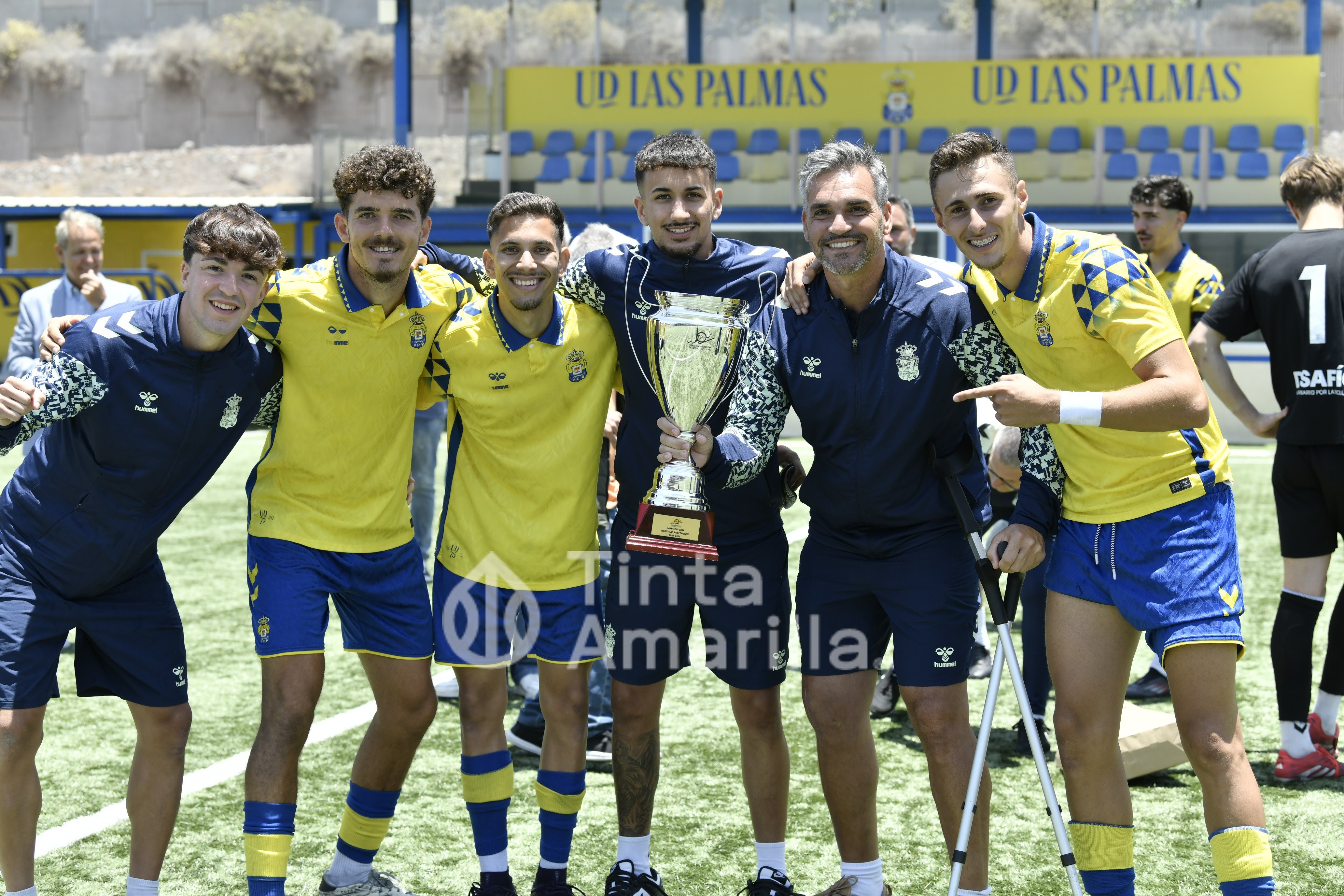 La más reciente imagen de Zeben Ramos -segundo a la izquierda- con sus compañeros de Las Palmas C, este pasado domingo tras recibir la Copa como campeón de la Preferente de Las Palmas. En el momento del accidente, el futbolista galdense se encontraba junto a otros miembros de filiales de la UD Las Palmas.