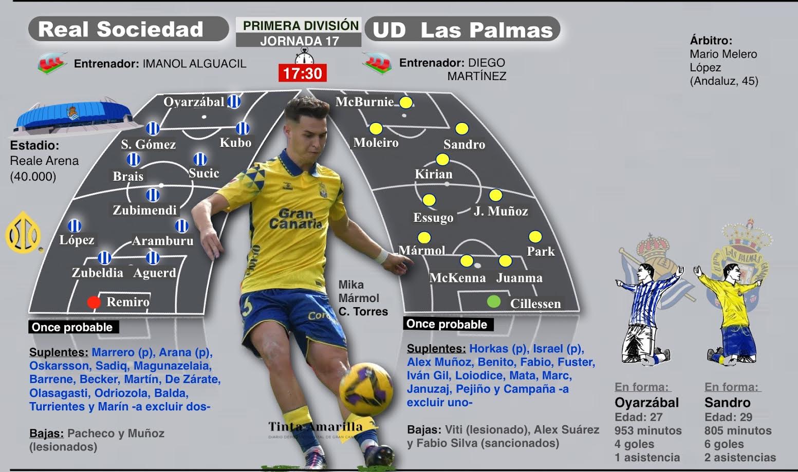 Y ambos acuden al encuentro con un propósito idéntico de prolongar el estado de gracia en el navegan actualmente. En el caso de la UD Las Palmas, además, saltará al césped de Anoeta conociendo que los tres ‘condenados’ de la parte baja de la clasificación solo avanzaron 1 punto la frontera del peligro con los amarillos. Por lo que un hipotético triunfo en Anoeta podría ser también un salto cualitativo más para que crezca la esperanza de la salvación.