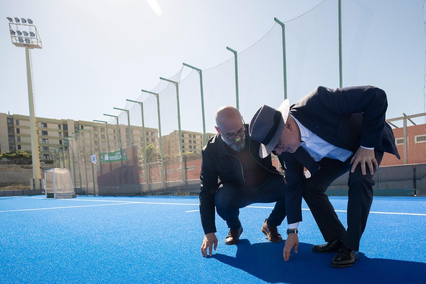 El presidente del Cabildo de Gran Canaria, Antonio Morales, junto al consejero de Deportes, Aridany Romero, ha visitado el campo de hockey hierba de la Ciudad Deportiva Siete Palmas tras la finalización de las obras de renovación, una actuación que ha supuesto una inversión de 809.208,15 euros. Con esta intervención, la instalación cuenta ahora con un pavimento deportivo de última generación, mejorando sus condiciones para albergar competiciones de máximo nivel.