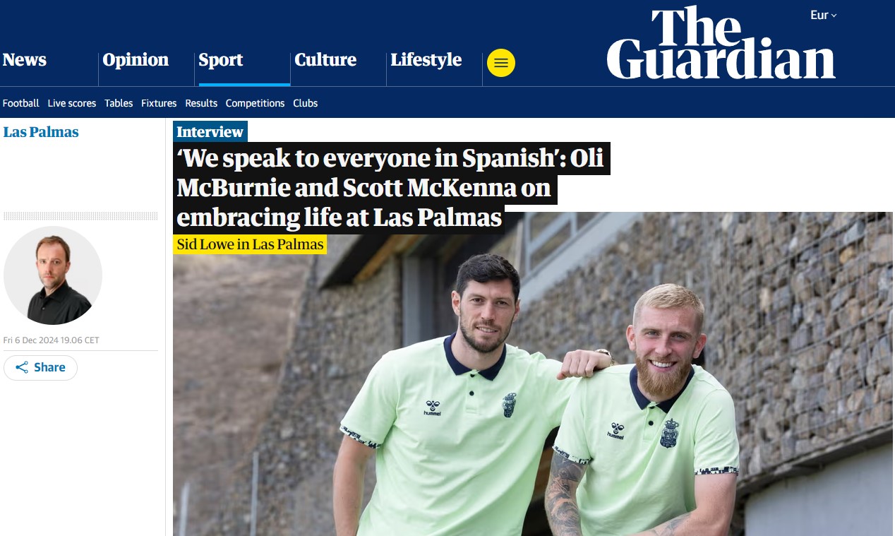 La presencia de los internacionales escoceses de la UD Las Palmas (McKenna y McBurnie) no pasa inadvertida en el Reino Unido. El prestigioso diario The Guardian ha realizado un reportaje en las últimas horas a ambos para exponer sus primeros meses en la isla, sus vivencias y primeras conclusiones sobre la Liga.