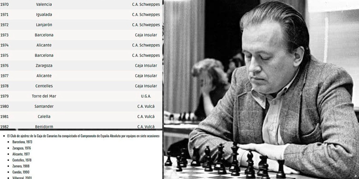 Bent Larsen, a la derecha. A la izquierda el palmarés de la Federación Española y del club de La Caja, donde se ignora a la UD Las Palmas como campeón y por error se concede al quinto clasificado del torneo nacional de 1978