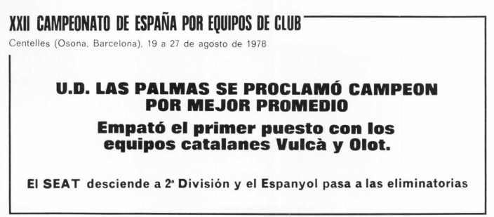 Al evento acudieron los jugadores como resultado de unas negociaciones de rescate del club Maspalomas Costa Canaria, en dificultades económicas. Con la intervención del presidente de la Federación Provincial de Ajedrez, Juan Marrero Portugués, la UD Las Palmas aportó su nombre al equipo que logró el título nacional de 1978 con 18,5 puntos, empatado con los equipos catalanes Vulcá y Olot. Pero el mejor coeficiente tras cubrir el calendario de partidas hizo el que el trofeo viajara hasta Gran Canaria.