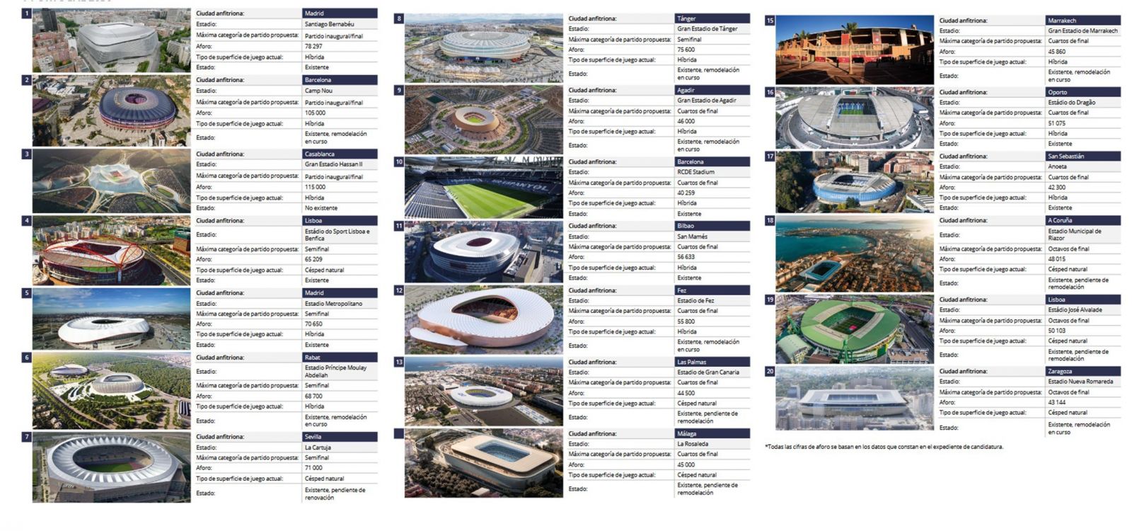 Con mejores calificaciones: Con 4,3 figuran el Estadio Bernabéu, el Nou Camp y el Gran Estadio Hassan II (Casablanca), que optan a ser sedes de los partidos de la inauguración y final del torneo. También tiene esta consideración de 4,3 el Metropolitano.