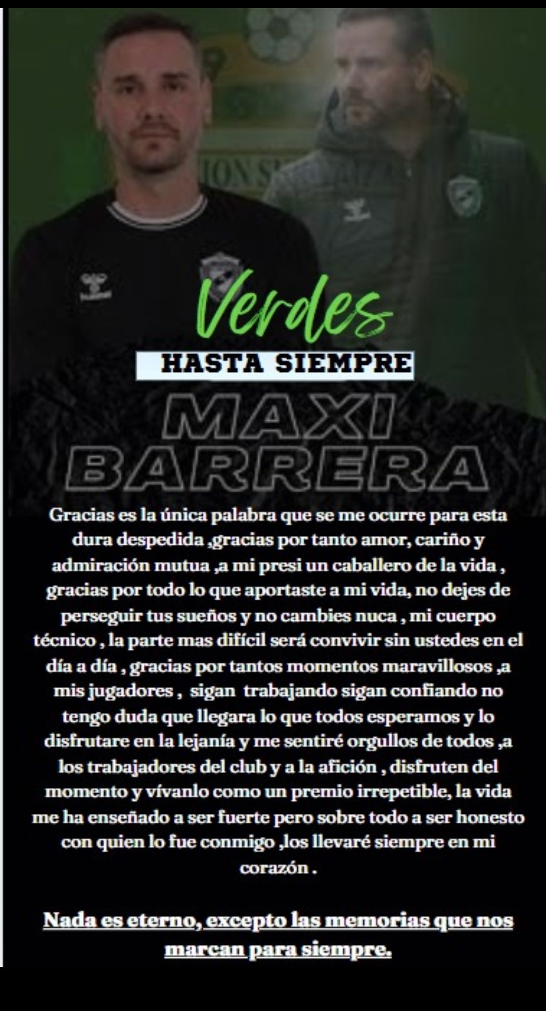 Añadió que Maxi "siempre quedará en la historia como el entrenador que nos ascendió a Segunda Federación, algo que nunca había sucedido en una entidad tan pequeña y modesta como la nuestra".