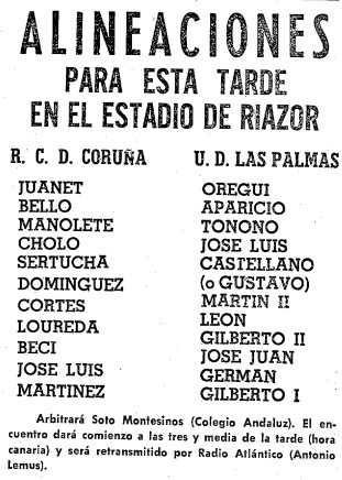 Aquel equipo estaba integrado por Santiago Jiménez (Porteño), Rafael Suárez (UD Las Palmas), Paco Castellano (UD Las Palmas), Juan Mujica (Arucas), Pedro Las (UD Las Palmas), Oscar Ramírez (UD Las Palmas), Juan Oramas (Vega Guerra), Manolo Martín (UD Las Palmas), Germán Dévora (UD Las Palmas), Lolín Pérez (Argentino), José Manuel León (UD Las Palmas), Pedro Pérez (UD Las Palmas), José Luis Megido (UD Las Palmas) y Antonio Juan Viera (Arucas). Los reservas que fueron Gustavo González (Arucas), Manuel Blanco (UD Las Palmas), Cipriano Márquez (UD Las Palmas), José Juan Ramírez (Gran Canaria) y Carmelo Cachicha (Argentino). |