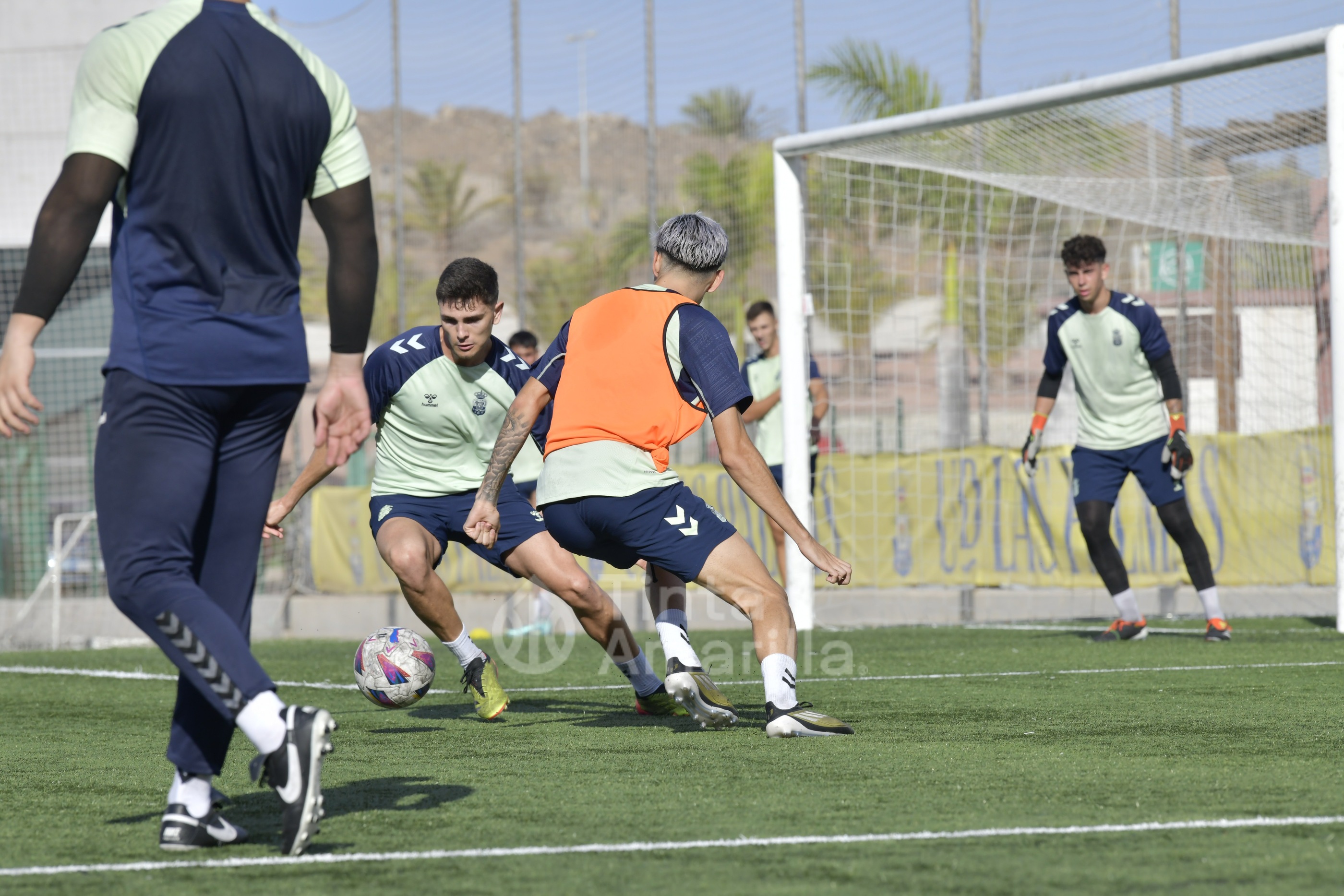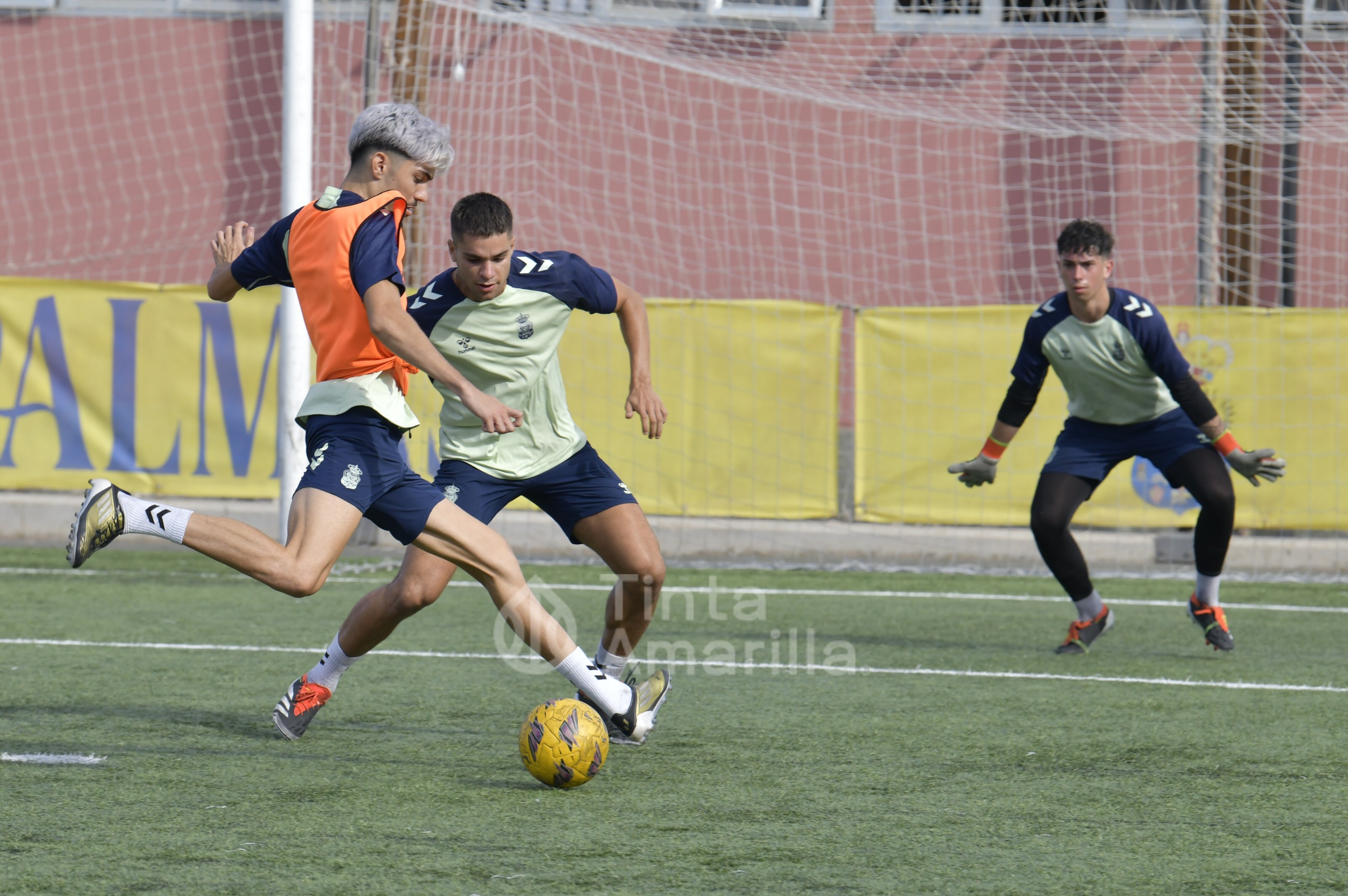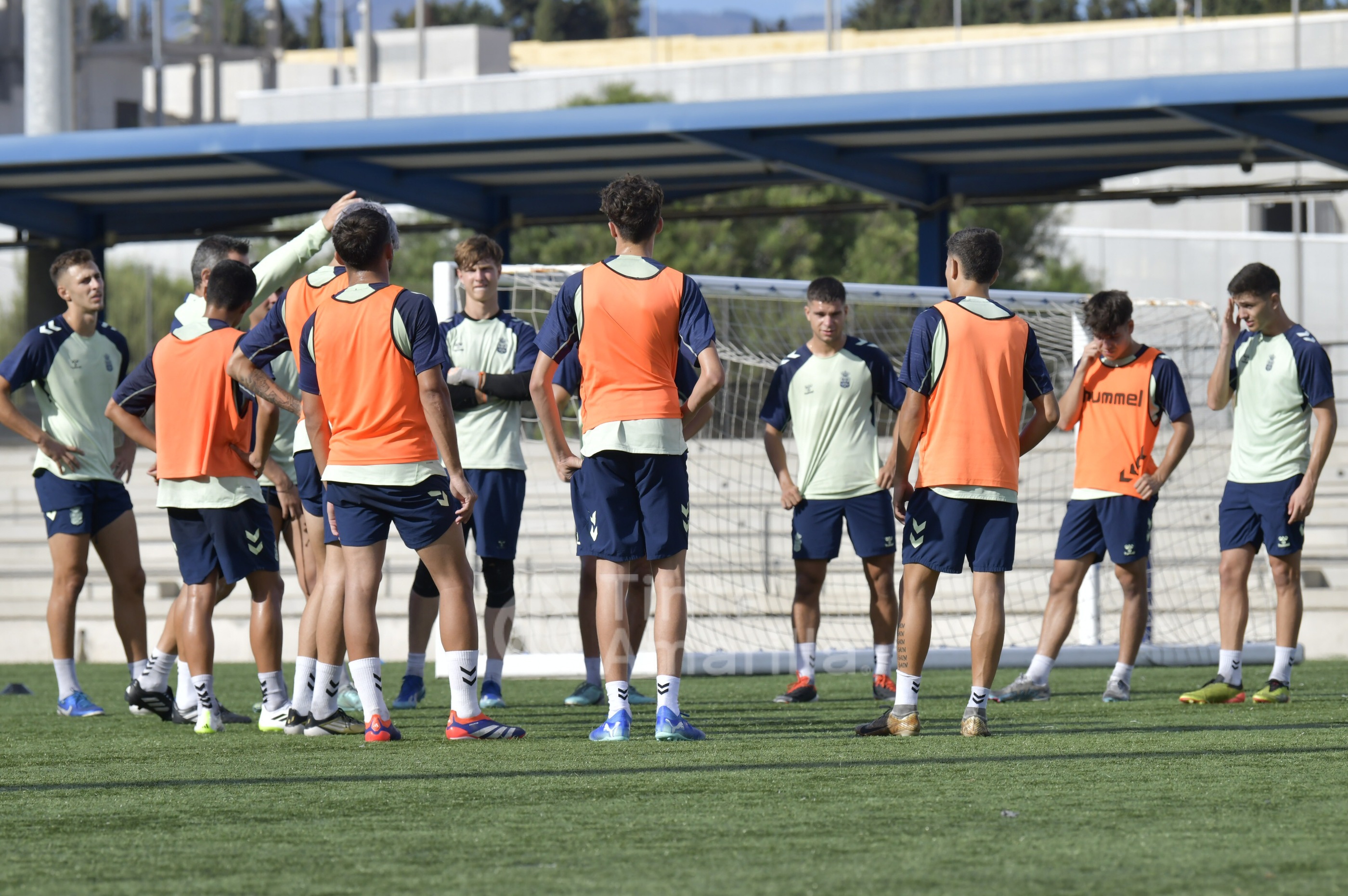 Los futbolistas de José Antonio Robaina se ejercitan, contando en las instalaciones con la presencia del delantero lesionado Tomás Medina, que está en el inicio de su recuperación tras la reciente operación quirúrgica.