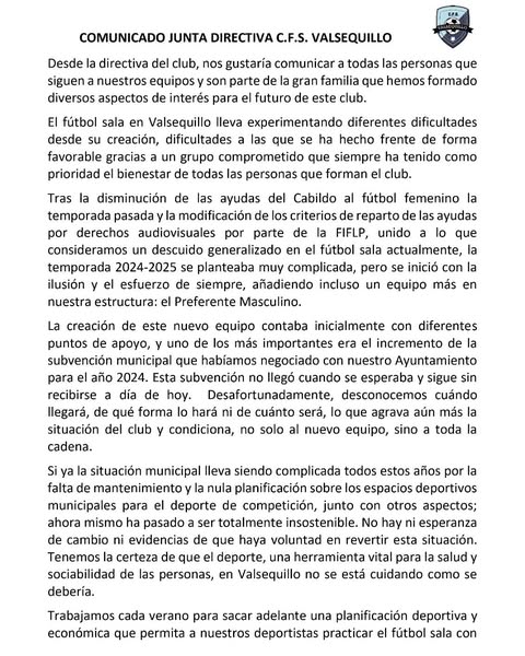 El club había añadido esta temporada un equipo más a su estructura (Preferente masculino), contando “con diferentes puntos de apoyo, uno de los más importantes era el incremento de la subvención municipal que habíamos negociado” (…) “para el año 2024. Esta subvención no llegó cuando se esperaba y sigue sin recibirse a día de hoy”, afirma el CFS Valsequillo, “desconocemos cuándo llegará” ni “cuándo será”.