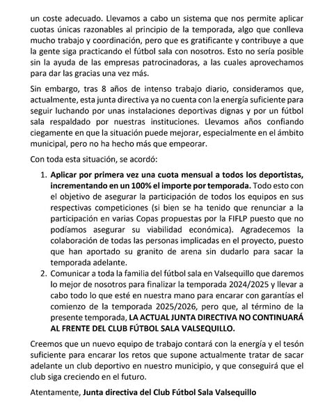 En el epílogo del escrito, la directiva valsequillera afirma que “tras 8 años de intenso trabajo diario, consideramos que esta junta directiva ya no cuenta con la energía suficiente para seguir luchando por unas instalaciones deportivas dignas y por un fútbol sala respetado por nuestras instituciones”.