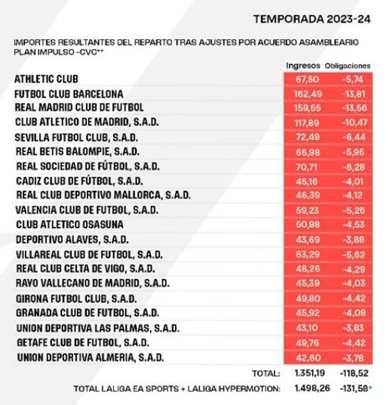 En Primera, se distribuyeron un total de 1.351 millones correspondiendo al FC Barcelona la mayor cantidad (162,49), seguido del Real Madrid (159,55) y Atlético de Madrid (117,89).