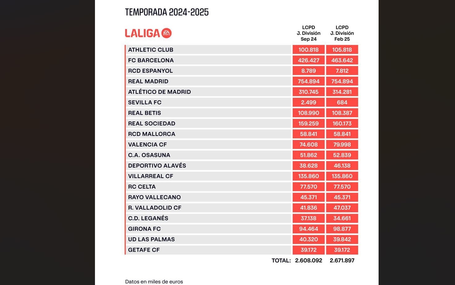 La UD Las Palmas se mantiene entre los que menos tienen de la categoría, con 39,8 millones de euros. El que más, el Real Madrid, con 754 millones.