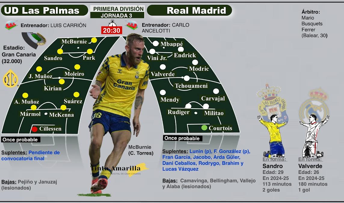 Pero un partido frente al Real Madrid, que llega al Gran Canaria con todas sus más luminosas estrellas salvo Bellingham, no permitiría ausencias o licencias temporales de los amarillos. Requiere un 200% en todos los aspectos del juego, tanto para atacar como para contener las piernas de Mbappé, las habilidades de Vinicius o la astucia del joven Endrick. Y aún así tiene más argumentos Ancelotti como para arrebatar la tranquilidad al meta Cillessen. Al margen de ello, los visitantes saben que su principal rival en la Liga ha copado todos los puntos ya disputados.