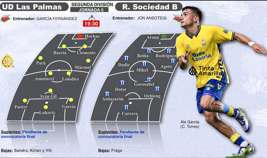 La Real Sociedad no ha comunicado la convocatoria oficial para el encuentro, sin embargo los medios vascos aseguran que el portero titular Aitor Fraga es baja para el encuentro del Estadio de Gran Canaria. Tampoco este detalle lo había comentado en la víspera el técnico, Jon Ansotegi.