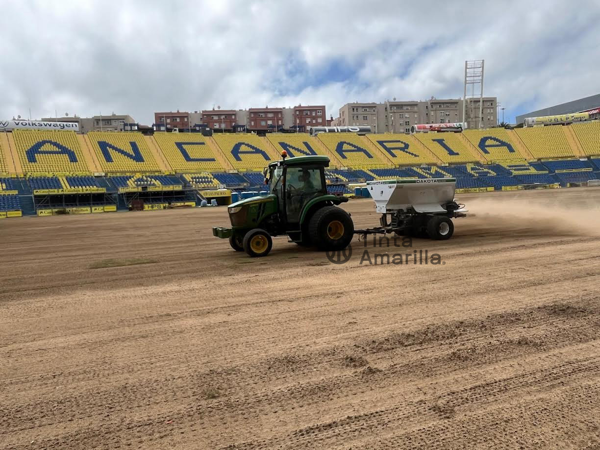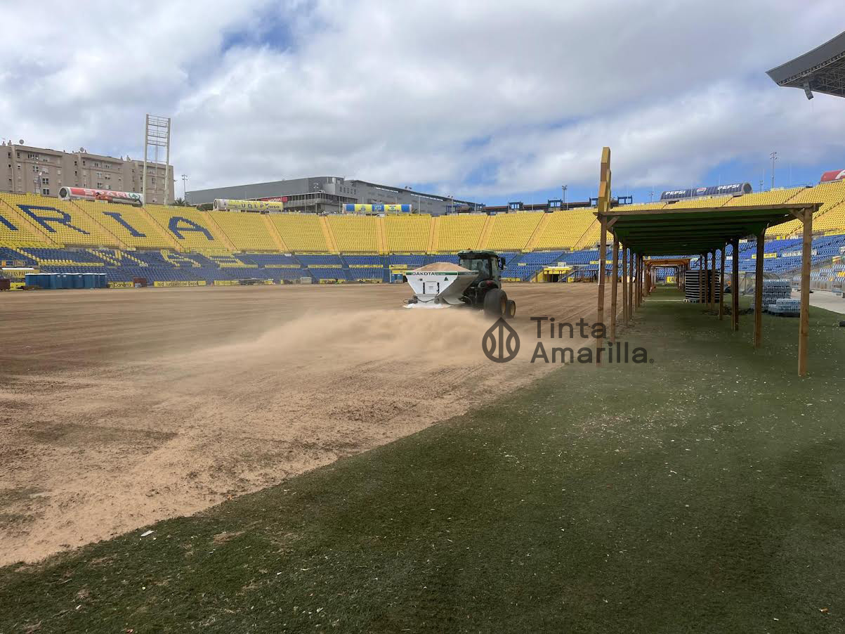 El césped del Estadio de Gran Canaria avanza a todo tren hacia el 16 de agosto, fecha del estreno de la Liga 2024-25 frente al Sevilla.
