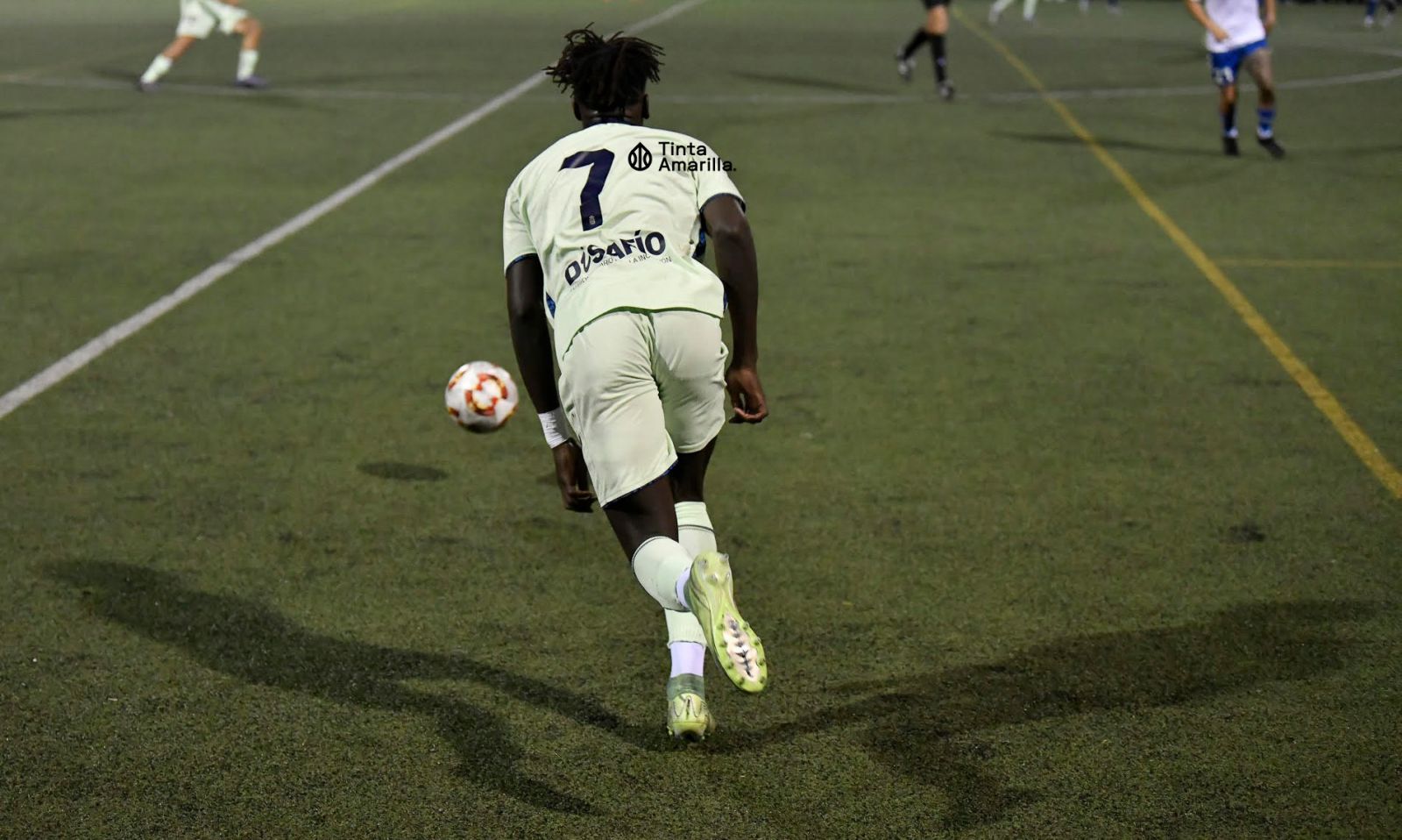 Una curiosa imagen en plena ofensiva de Las Palmas Atlético. Saliou Mandiang -autor del primer gol- tiene una doble sombra, que proyecta su situación en el campo y la de los focos del estadio de Juan Guedes. Ambas brotan partiendo desde la pisada de su pie derecho. Por momentos, el defensor que tenía que seguir sus carrera debió pensar que efectivamente eran dos ... por su multiplicación en el ataque amarillo.