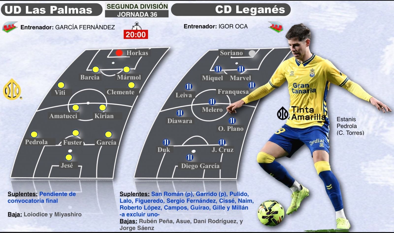 Las Palmas tiene un nuevo problema porque su delantero más en forma actualmente, quizá el mejor jugador del último mes (Taisei Miyashiro) no estará durante un tiempo por la microrrotura en el músculo isquiotibial izquierdo, lesión que sufrió al inicio del segundo tiempo del partido ante el Málaga. Se le puede abrir de nuevo la puerta a la titularidad a Estanis Pedrola, que tan buenas sensaciones dejó en el partido contra el Huesca.