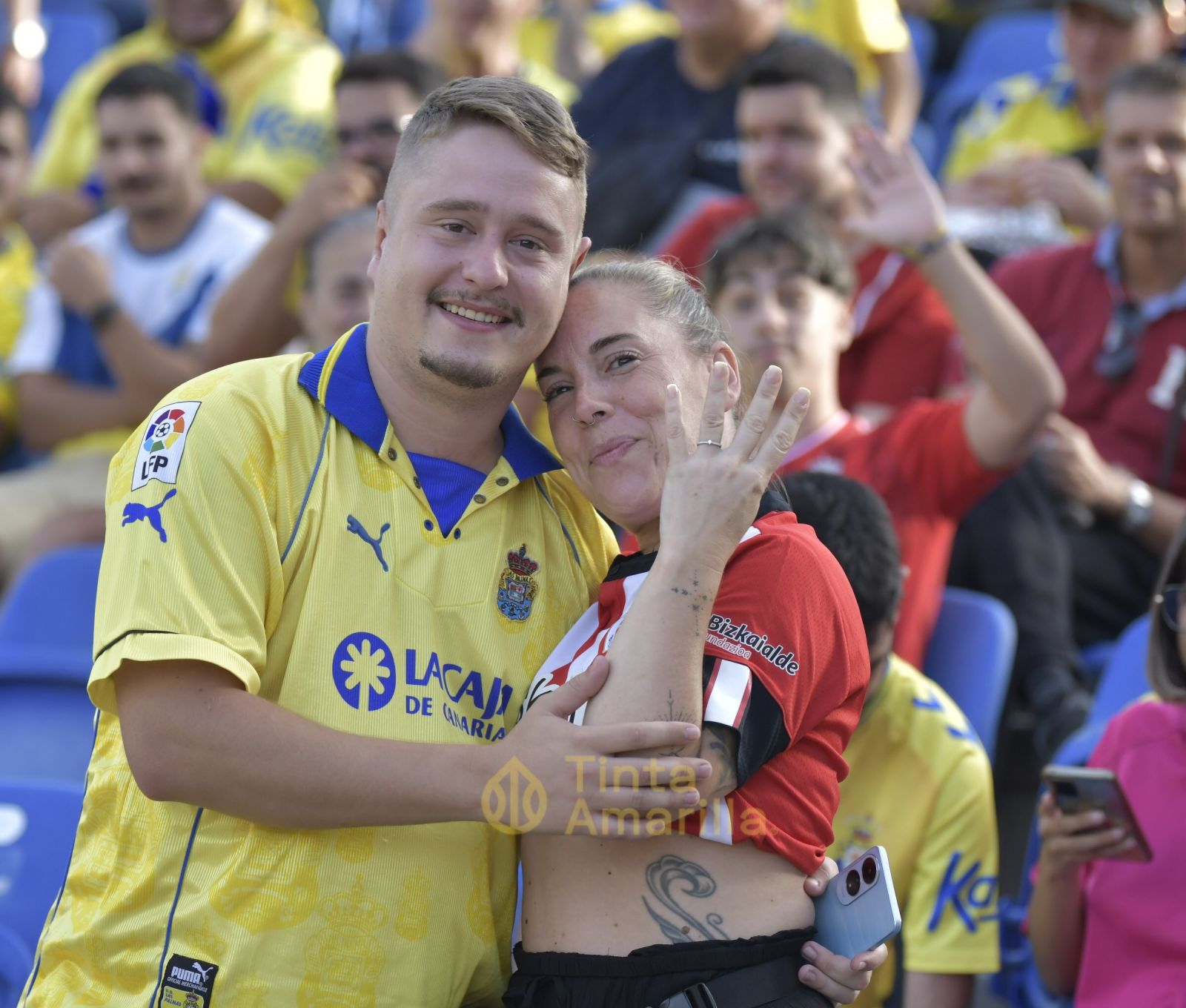 Hubo sorpresa en la grada Curva. El novio es amarillo y pidió matrimonio a su enamorada rojiblanca. Ganaba 0-2 el Athletic entonces, pero no desarmó el plan. Hubo entrega de anillo, besos, abrazos y ovación de los aficionados cercanos que se percataron del suceso. No había mejor momento que pedir matrimonio salvo en un UD Las Palmas-Athletic Club. Ahora queda por ver qué equipo elige la futura descendencia.
