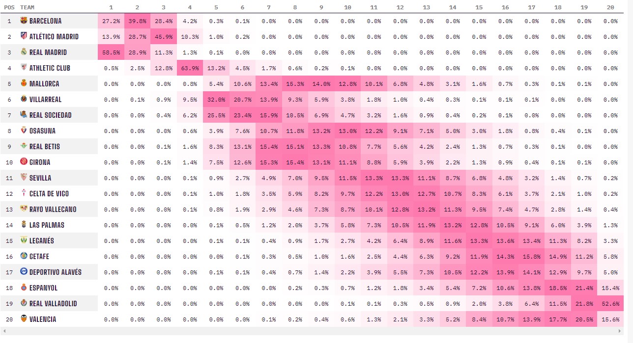 En septiembre, a la UD Las Palmas se le asignaba un 21,3% de posibilidades para acabar en el puesto 20º, un 15,8% para el 19º y un 13,2% para el 18º. Es decir, que el equipo entonces dirigido por Luis Carrión tenía un 50,3% de posibilidades de descender a Segunda División.