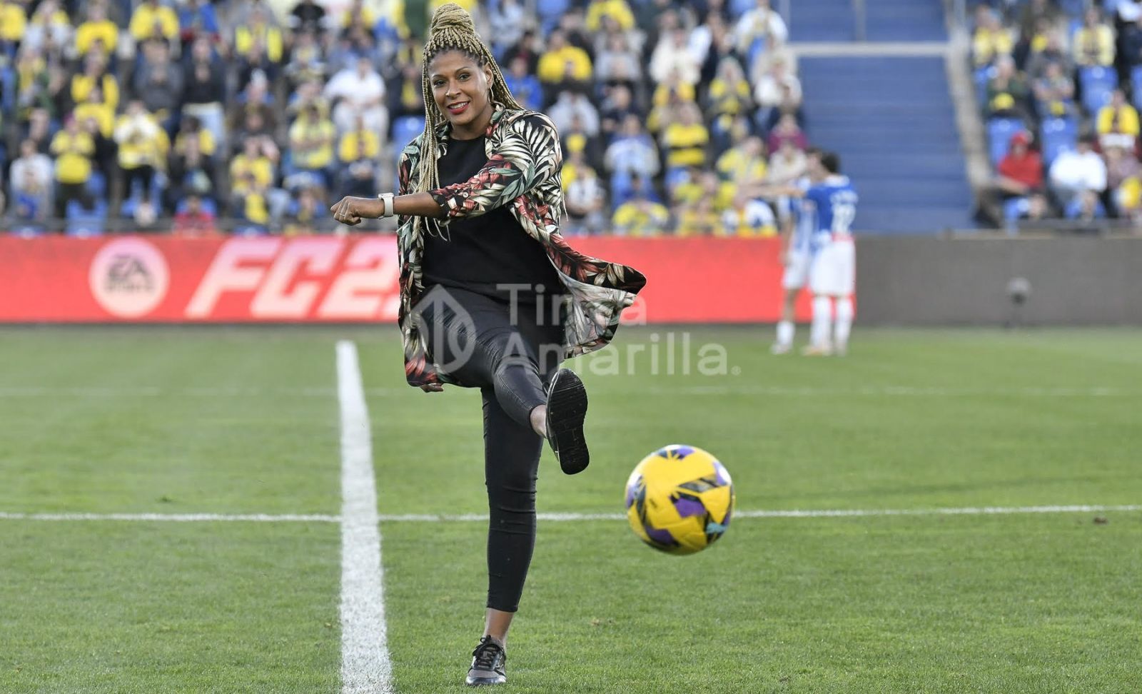 Hay muchas maneras de abordar el saque de honor. Este domingo le tocó el turno a una leyenda del balonmano grancanario, Marta Mangué, otrora también destacada atleta en sus inicios. Pero verla golpear el balón con su diestra, con un estilo tan depurado, deja entrever que habría tenido quizá también futuro en el balompié. La que sabe, sabe … de todo.