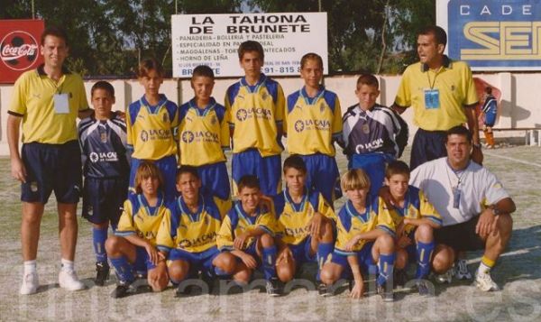 Tana, con el alevín de la UD Las Palmas en el torneo de Brunete de 2001, con Nandi Álvarez, técnico, y Javier Sintes, asistente. Es el tercero agachado desde la izquierda. En 2002 el equipo llegó a la final. (Archivo personal de Nandi Álvarez)