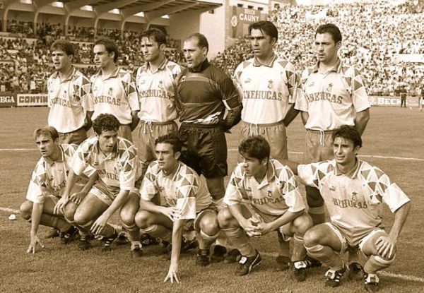 La formación del ascenso de 1996, frente al Elche: Socorro, Eleder, Espejo, Manolo, Toni y Ángel (de pie), Eloy, Asier, Jaume, Orlando y Paquito (agachados)