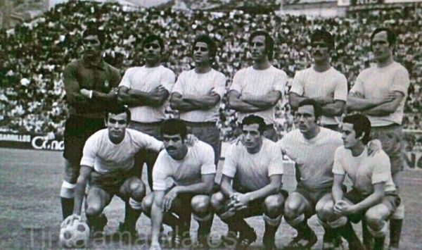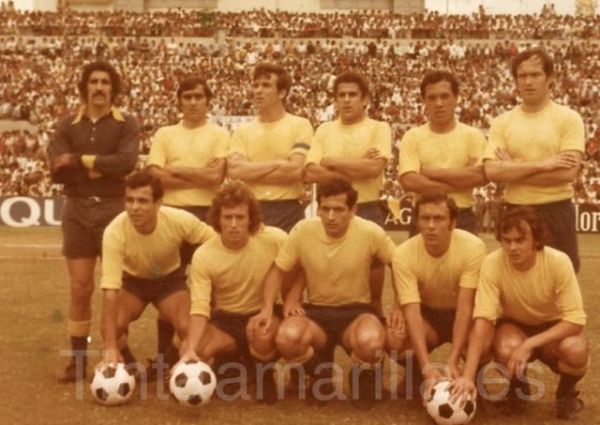 Alineación de 1975 frente al Celta, partido señalado por Pepe Juan. Arriba: Carnevali, Martín Marrero, Tonono, Hernández, Félix, Castellano; debajo Pepe Juan, Wolff, Fernández, Germán y Felipe Martín (Archivo de Norberto Rodríguez)