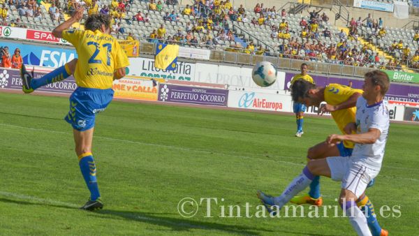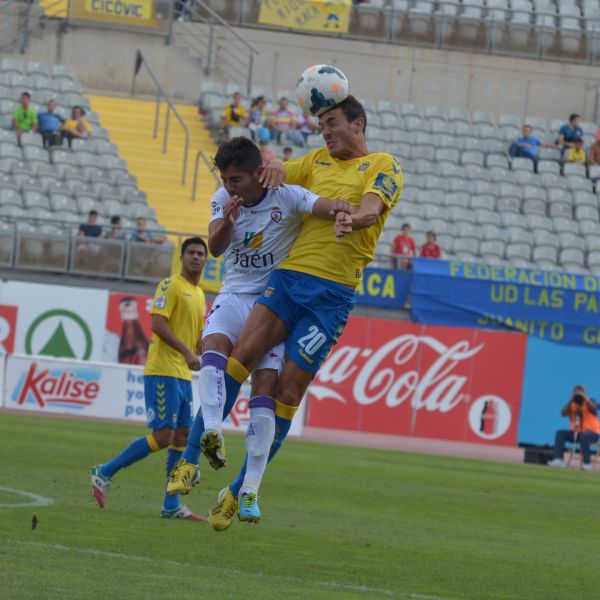 Los futbolistas de Sergio Lobera tardaron media hora en desbloquear al acorazado Jaén, que con dos líneas nutridas de efectivos alejaban el balón de su área. Las Palmas combinaba hasta ese momento con paciencia, pero sin profundidad. Apoño asumía la dirección de juego presentándose en todas las iniciativas pero estas no tuvieron fruto hasta que, por fin, encontró por la derecha la acción que le daría la primera renta. La fabricó Aranda y la certificó Masoud, con un excelente cabezazo.