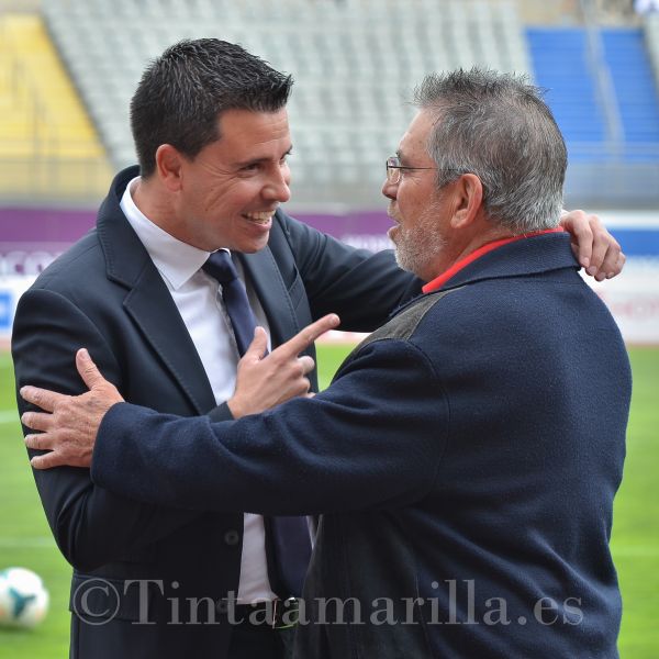 A la derecha, el abrazo de Lobera con Pacuco Rosales antes de empezar el encuentro (C. Torres)