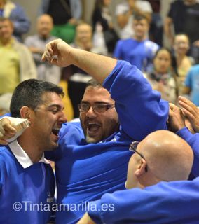A la izquierda, Roque -con el brazo escayolado- celebra con sus compañeros el título de la Liga 2012-13 ganado al Adargoma (C. Torres)