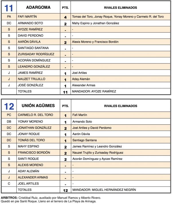 Los tres primeros puntos de la noche llegaron de la mano juvenil del Adargoma. El Agüimes sacó a pasear pronto al ejército que posee en sus manos Miguel Hernández Negrín. Entre Mahy Espinoy Francisco Bordón llegaron los puntos del cambio de dominio en el marcador. Resultaron espectaculares las cogidas de muslo y 'levantás' de Bordón, espoleado por la animosa hinchada lagartera.